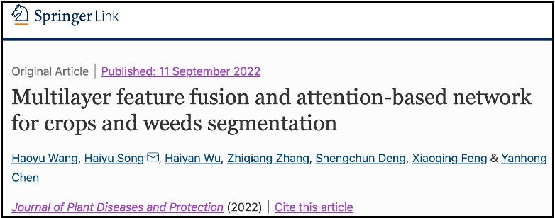 2019级计算机1班本科生王浩宇同学在导师组宋海裕副教授和吴海燕博士的共同指导下,在JCR二区期刊《Journal of Plant Diseases and Protection》上发表了题为“Multilayer Feature Fusion and Attention-based Network for Crops and Weeds Segmentation”的研究论文。这是雷速体育app