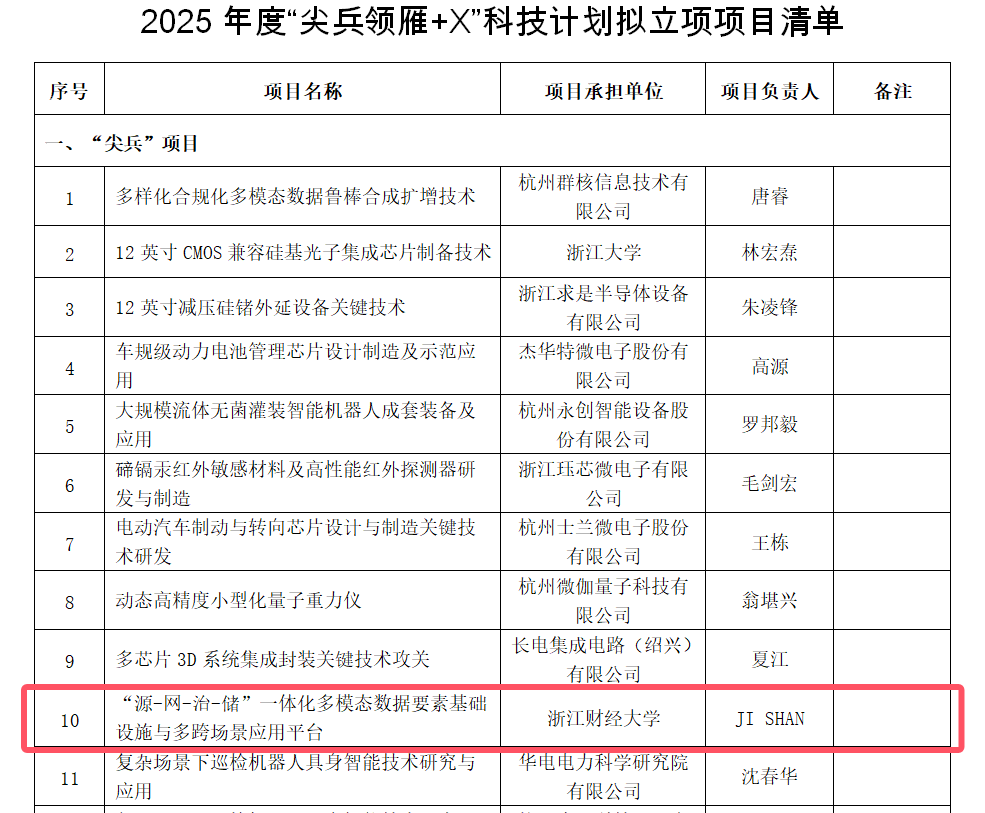 牵头、Ji Shan博士团队申报的“‘源-网-治-储’一体化多模态数据要素基础设施与多跨场景应用平台”获浙江省“尖兵”重大科技计划项目立项。这是我校首次获批浙江省“尖兵”重大科技计划项目,彰显了我校研发攻关和科技创新综合实力的显著提升。