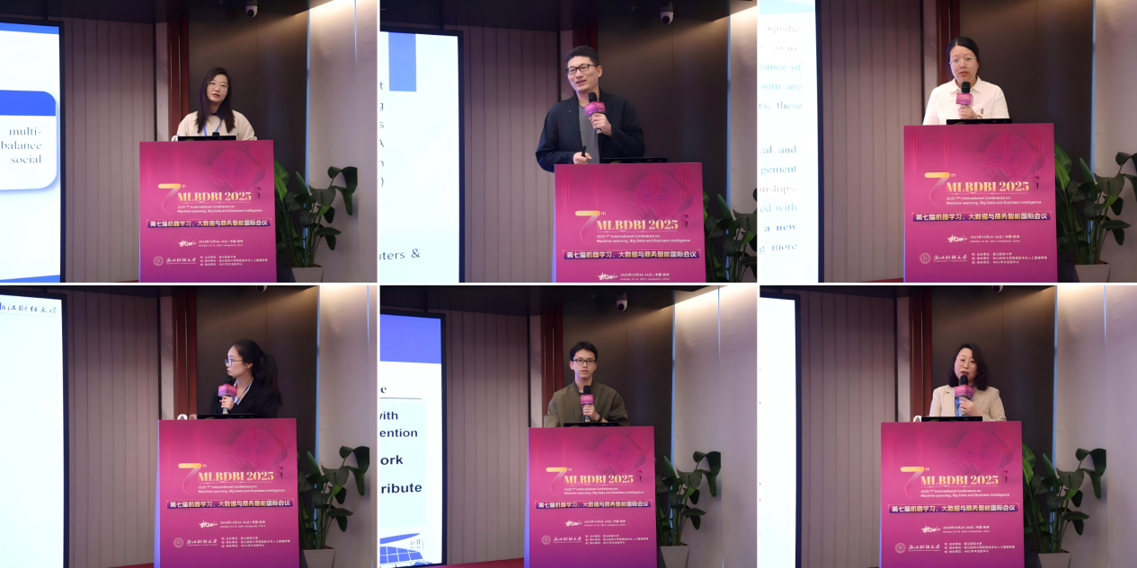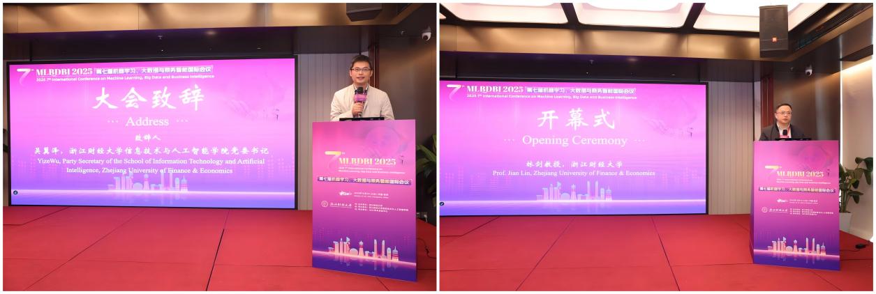 2025年10月24日至26日,由浙江财经大学主办,浙江财经大学信息技术与人工智能学院承办,AEIC学术交流中心协办的第七届机器学习、大数据与商务智能国际会议(MLBDBI 2025)在杭州成功举办。武汉大学王峰教授、大连海事大学白丹宇教授、澳门科技大学高开周教授、浙江工商大学毛郁欣教授、浙江财经大学信智学院党委书记吴翼泽、信智学院副院长林剑等出席会议。来自澳门科技大学、浙江财经大学、天津职业技术师范大学等全国多所高校,太湖流域管理局、甘肃省气象服务中心、建设银行等多家企事业单位的专家学者、青年教师、研究生等齐聚杭州,共同交流机器学习、大数据与商务智能的最新研究进展和未来趋势。
