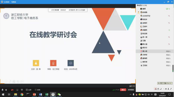 疫情期间打乱了现场教学的节奏,杨水清老师积极开展党支部网上会议,联络支部成员,商讨与安排疫情期间团队师生的防疫与研讨学习工作。在“停课不停学”的总体要求下,陈明晶老师积极组织网上教学研讨会,确保在线教学的顺利开展。2020年2月,开展在线教学准备前的演习准备工作,确保每一位同学每一位老师都能上好每一次课;2020年3-4月,开展多次在线教学研讨会,分享在线教学经验,探讨提高教学效果的举措,以及课程思政的应用等。