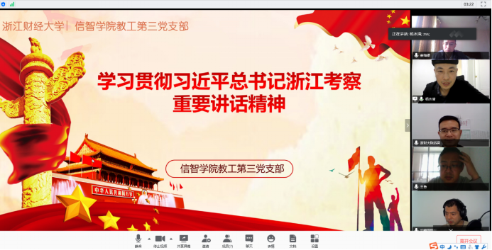 2020年4月23日,浙江财经大学信息管理与人工智能学院教工第三党支部开展理论学习,专题学习贯彻习近平总书记浙江考察重要讲话精神。会议由支部书记杨水清主持,支部成员参加学习。