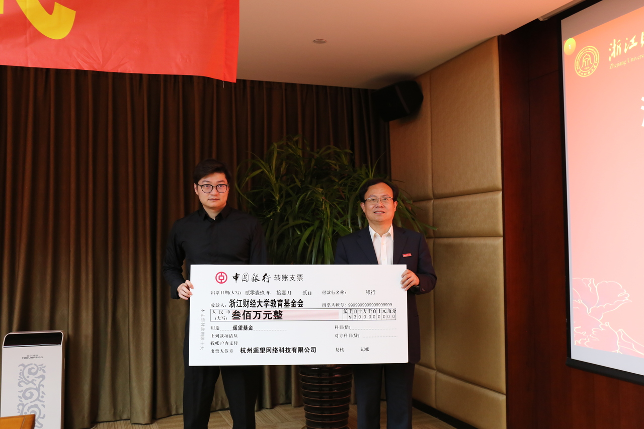 2019年11月2日下午15:30,浙江财经大学信息管理与工程学院举办“遥望基金”捐赠签约仪式。出席本次签约仪式的有杭州遥望网络科技有限公司董事长兼CEO谢如栋校友,校友总会会长、校党委书记李金昌,校友总会副会长兼秘书长、党委副书记黄建新,党校办副主任郑纪达,校友总会办公室主任马亦群,计划财务处处长童玉玲,教务处副处长石向荣,信工学院院长张文宇等,签约仪式由信工学院党委副书记陆颋浩主持。