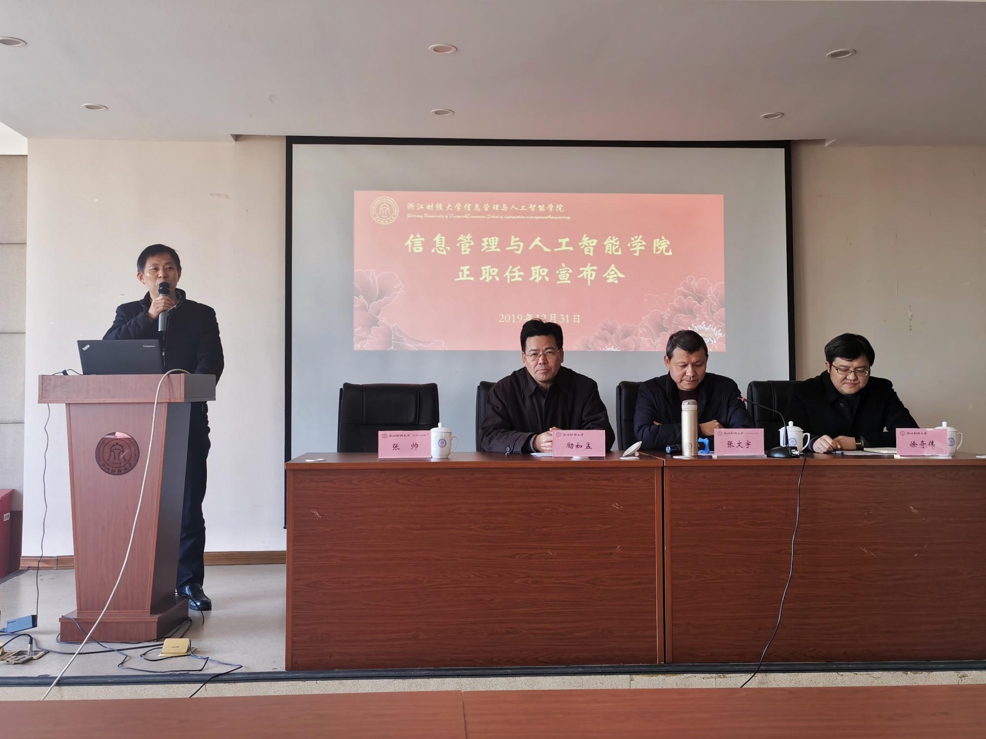 12月31日,信息管理与人工智能学院召开学院任职宣布大会,宣布学校党委关于信息管理与人工智能学院党委书记、院长的任命决定。副校长励如孟、党委组织部工作人员、学院领导班子成员以及全体教职工参加会议,会议由张文宇主持。