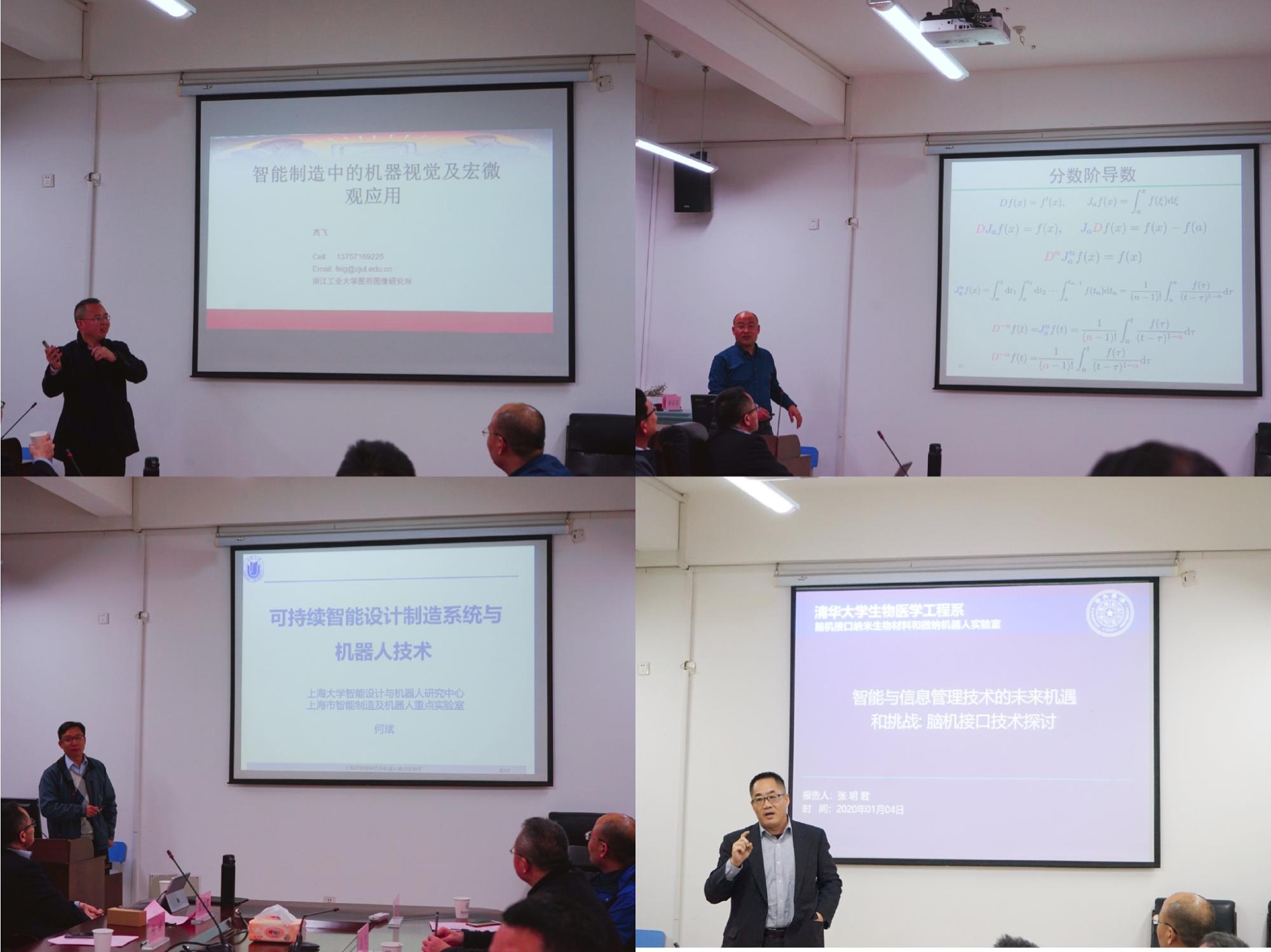 本次会议由学院院长张帅教授主持。浙江工业大学图形图像研究所所长高飞教授、石家庄铁道大学的牛江川教授、上海大学机器人与智能设计研究中心主任何斌教授、美国俄亥俄州立大学的张明君教授分别为大家带来“智能制造中的机器视觉及其宏微观应用”、“基于分数阶磁流变液模型的非线性镗杆动力学分析与振动控制”、“可持续智能设计/制造系统与机器人关键技术”、“智能与信息管理技术的未来机遇和挑战——脑机接口技术探讨”等主题报告。四位专家从自身研究出发,分享了各自最新的前沿研究成果,并和参会嘉宾一起探讨了我国智能制造领域面临的关键问题及未来的发展方向。