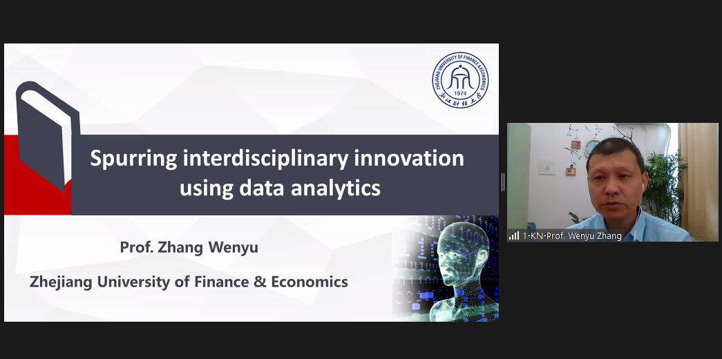 张文宇教授。他们围绕大数据技术与商业信息系统,跟与会人员分享学术成果和科研经验,并在问答环节与其他与会者展开热烈的讨论。张文宇教授的主旨报告题目是Spurring interdisciplinary innovation using data science methodology。