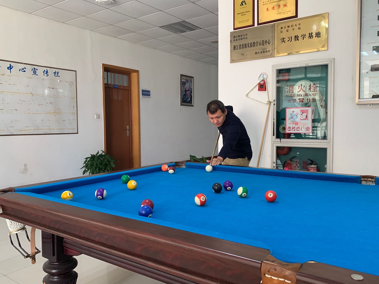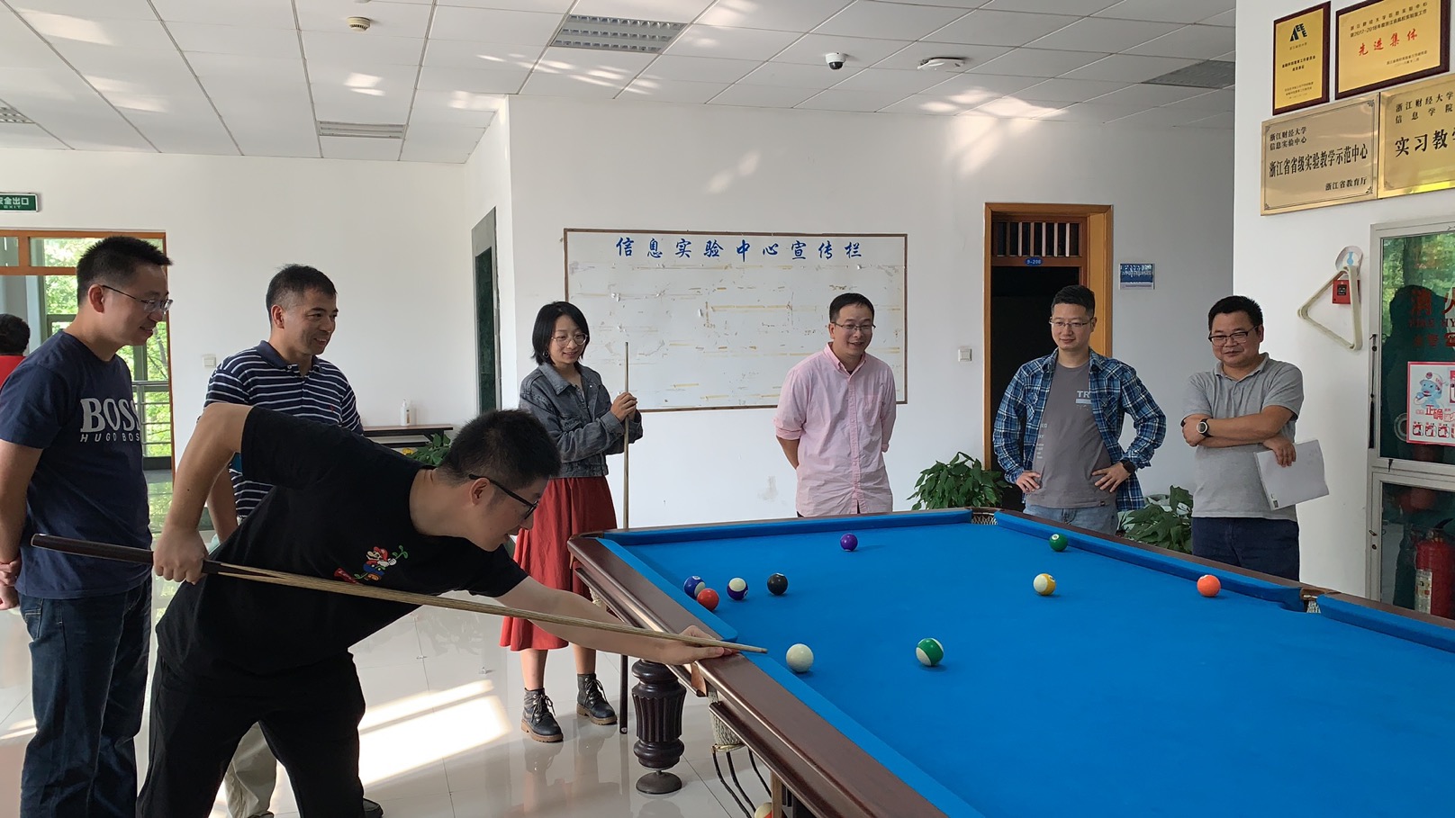 赛前学院台球爱好教师利用休息时间勤加苦练,分工会精心布置场地,更新设备。台球赛正式拉开序幕,经过抽签30多位参赛教师分成男子组、女子组进行两两对决,胜者晋级下一轮,直至最终角逐冠亚军。