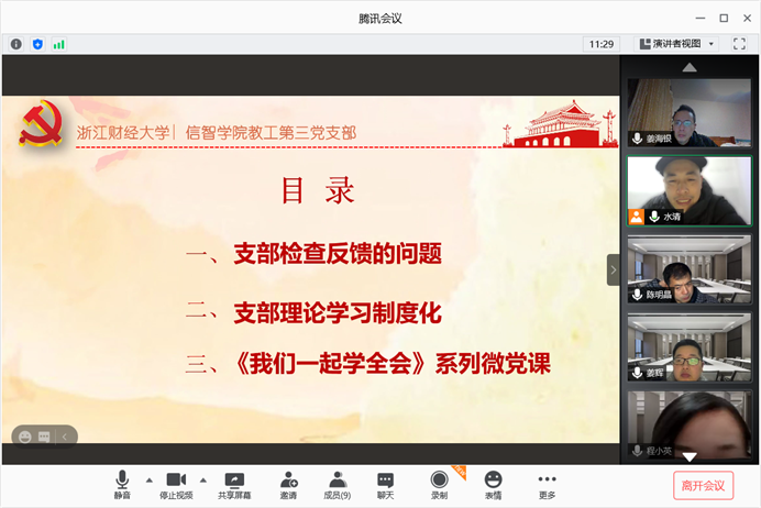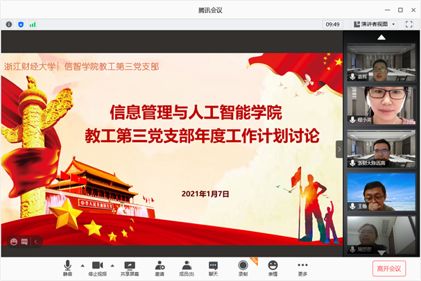 为更好地贯彻落实“三会一课”,学习《我们一起学全会》系列微党课,推进学习教育常态化和制度化,2021年1月7日,信息管理与人工智能学院教工第三党支部在线开展支部党员大会,商讨支部2021年度工作计划。