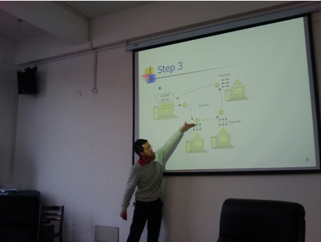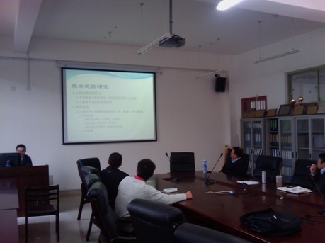 在报告会上,课程组成员首先分别介绍了本年度本人在制造服务研究方向上所做的工作和取得的进展。然后,张文宇教授和姚建荣教授总结了课题组本年度的主要工作,并对下一年度的研究重点和任务安排做了初步部署。最后,齐峰老师做了“一种改进的基于本体的概念语义相似度算法研究”的学术报告,陈远高老师做了“云制造服务链中服务定价与协调机制研究”的学术报告,应小凡老师做了“基于语义和移动Agent的网络化制造协同研究”的学术报告。