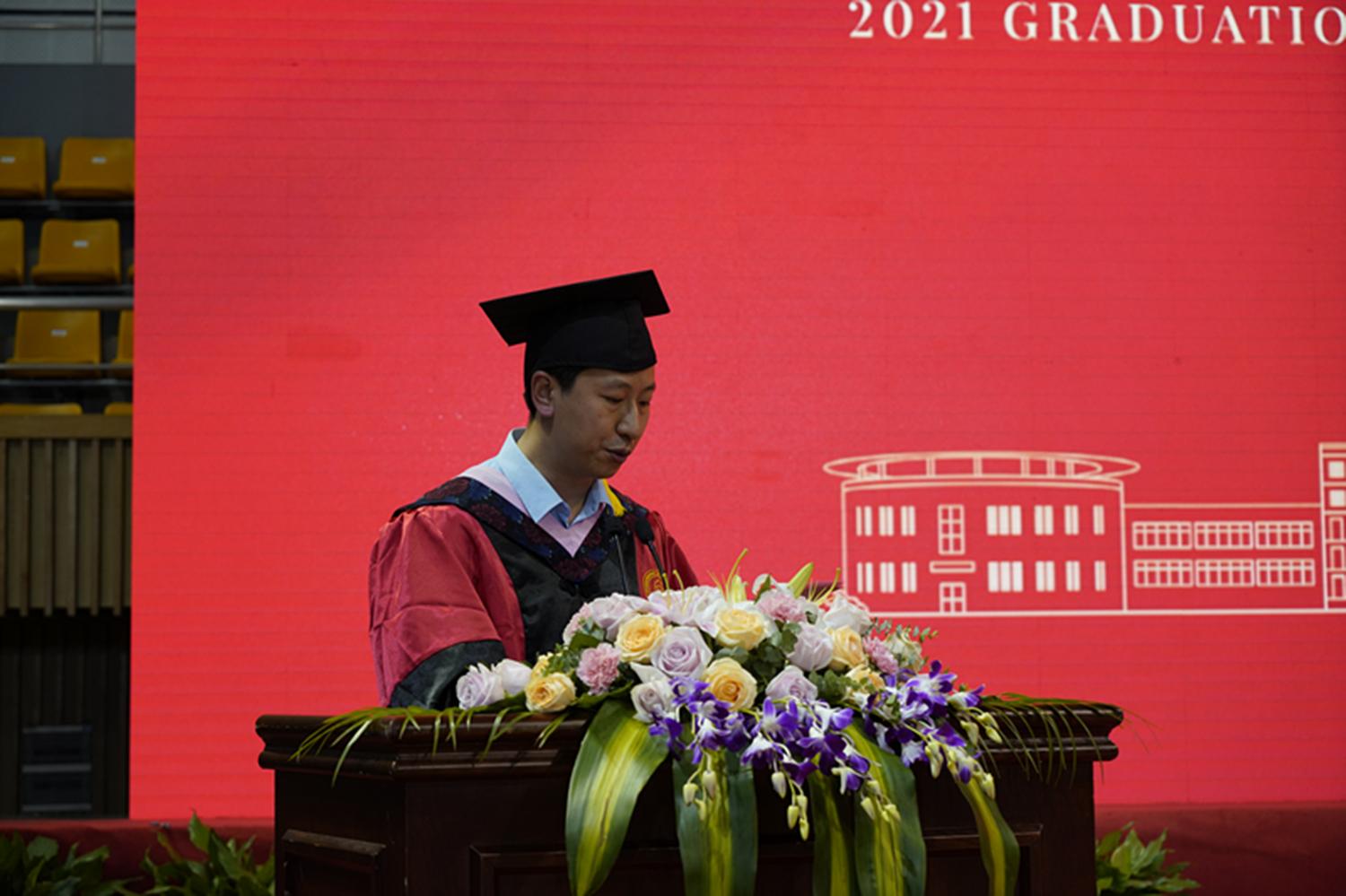 田聪书记代表学院肯定了各位本科毕业生大学四年的学习和努力成果,向所有毕业生表达了最热烈的祝贺,并宣读了学校关于授予2021届本科毕业生学士学位的决定文件。