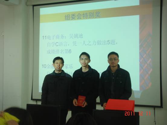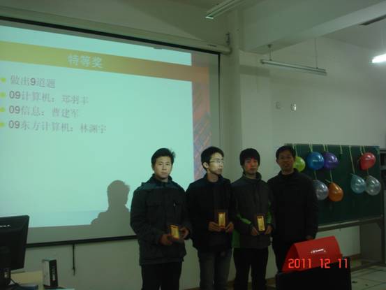经过激烈的角逐,此次的竞赛由09计算机郑羽丰,09信息曹建军,09东方计算机林渊宇独占鳌头。以9道的成绩成为获得此次竞赛最高奖—特等奖。另外本次比赛共产生一等奖4组,二等奖10组,三等奖30组,组委会特别奖2名,最佳女队奖1组,最具潜力奖1组,顽强拼搏奖1组。