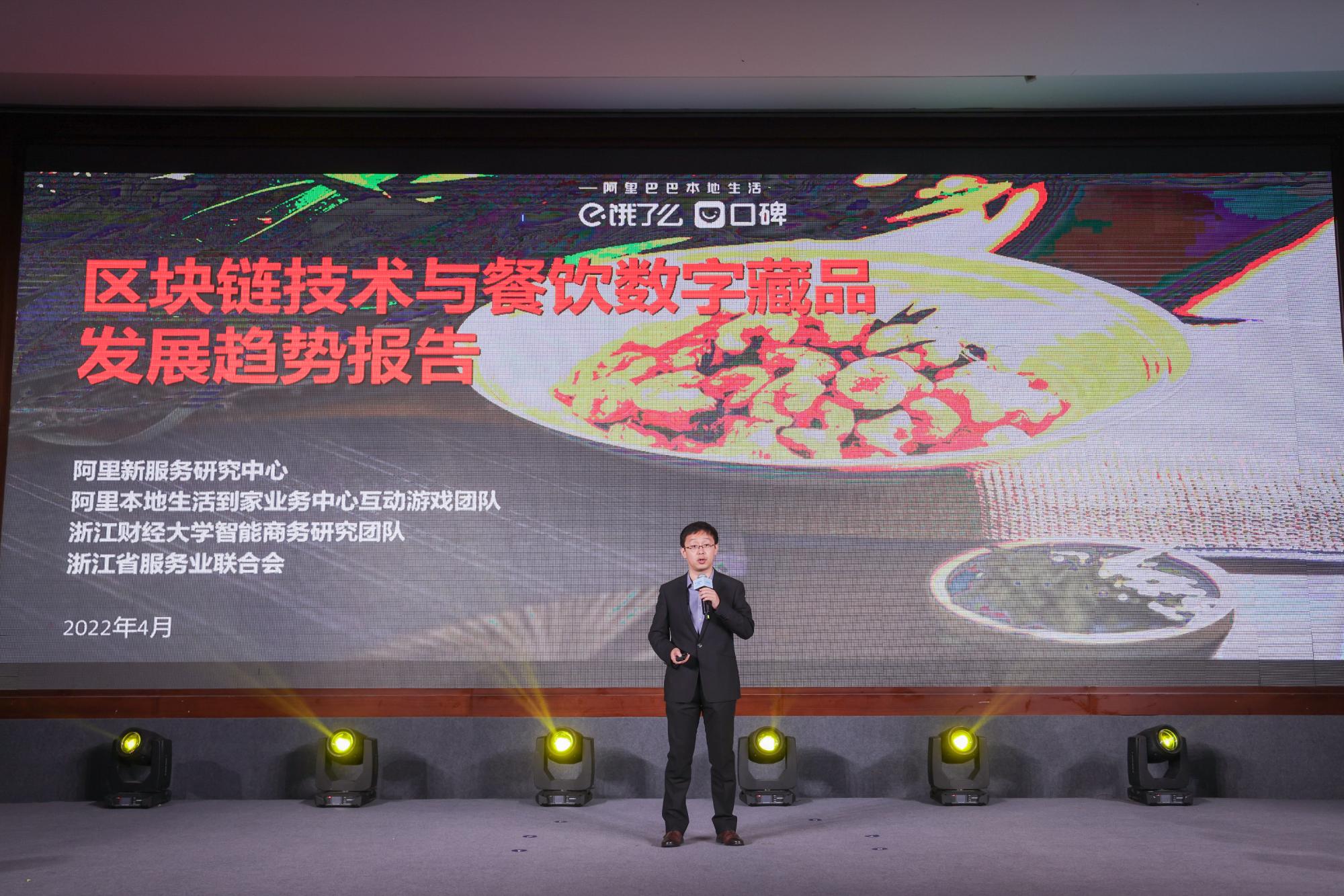 在本次发布会上,阿里新服务研究中心携手阿里本地生活到家业务中心互动游戏团队、浙江财经大学智能商务研究团队、浙江省服务业联合会共同发布《区块链技术与餐饮数字藏品发展趋势报告》,并由浙江财经大学电子商务系王鲁博士在发布会上做主题报告。