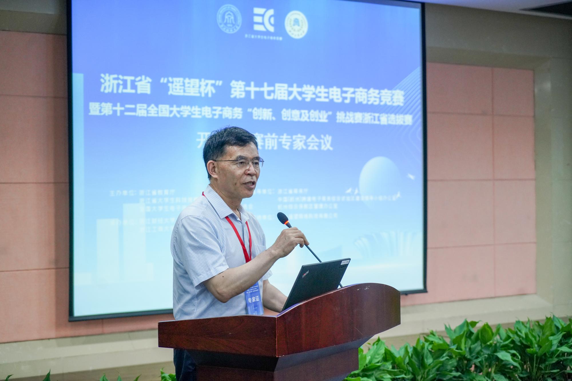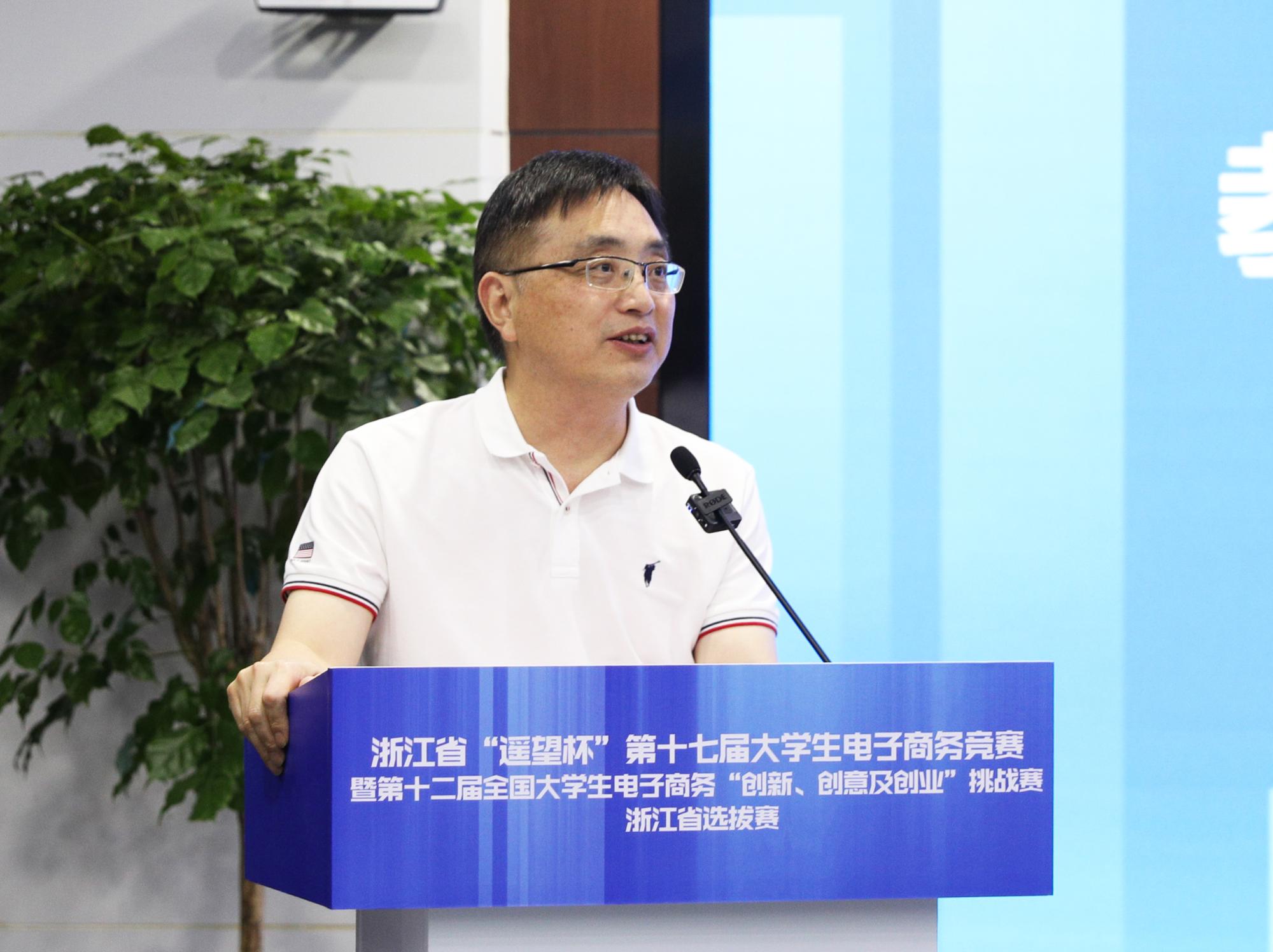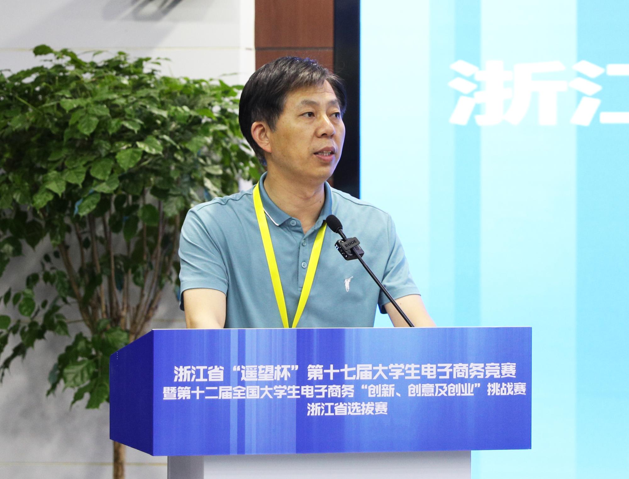 随后,教育部电子商务类专业教学指导委员会副主任章剑林致辞。他高度肯定了本届大赛,代表教育部电子商务类专业教学指导委员会和全国大学生电子商务“三创赛”竞赛组织委员对本届大赛的承办单位、志愿者和全省参赛师生表示感谢,并对所有获奖团队表示热烈祝贺。章剑林指出,此次大赛充分展现了浙江省浓厚的电子商务发展氛围、浙江省高校一流的电商竞赛水平以及参赛师生们的智慧。本届大赛参赛作品涉及范围广,作品主题和创意走在了全国高校前列,打响了浙江“电商军团”品牌。