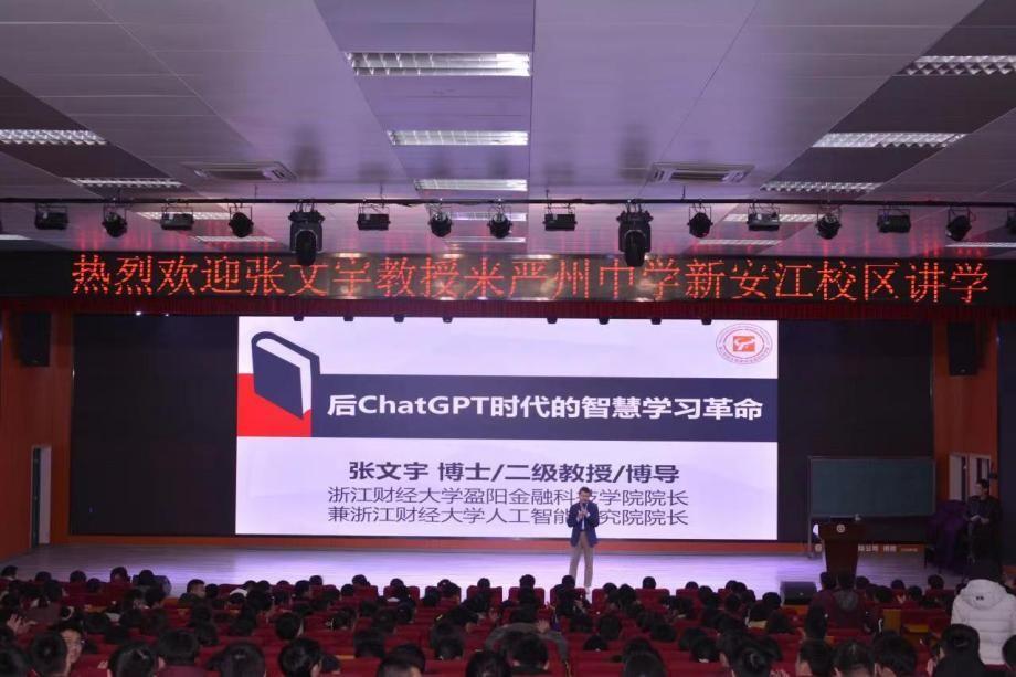 近日,受建德市人民检察院邀请,浙江财经大学二级教授、博士生导师、盈阳金融科技学院院长兼人工智能研究院院长、浙江省“我最喜爱的高校思政课老师”张文宇走进百年名校——浙江省一级重点中学严州中学。张文宇结合当前热点,为全体高二学生开展了一场主题为《后ChatGPT时代的智慧学习革命》的生涯规划演讲。800人的报告厅座无虚席,连走廊都挤满了学生。张文宇一如既往的“激情才情真情兼备,风趣幽默接地气”的脱口秀式演讲风格使现场欢呼声不断、爆笑全场,收获了20余次掌声。