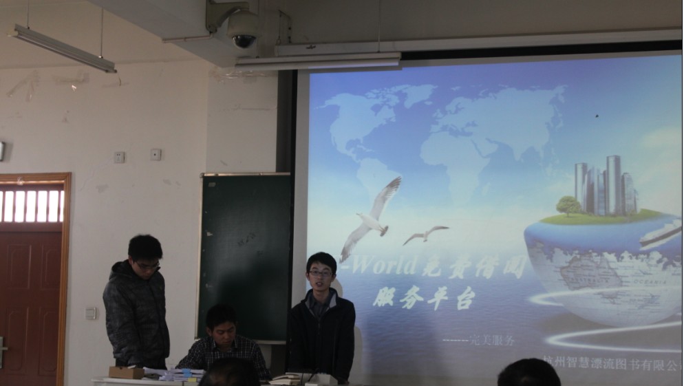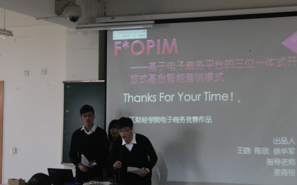 决赛答辩统一使用PPT演讲,参赛选手演讲时间为8分钟,之后进行评委提问,观众亦可提问。9-302教室座无虚席,十一个队伍分别通过幻灯片展示,向大家讲解他们团队创意的思维,独特的视角以及精心设计的作品。“蒲公英”、“Aili创意”等项目让我们看到了电子商务无限的发展潜力,而“个性化生态果蔬订单”、“RealTalk”、“意见分类与挖掘系统”等技术综合类项目则让我们领略了优秀的创作艺术。