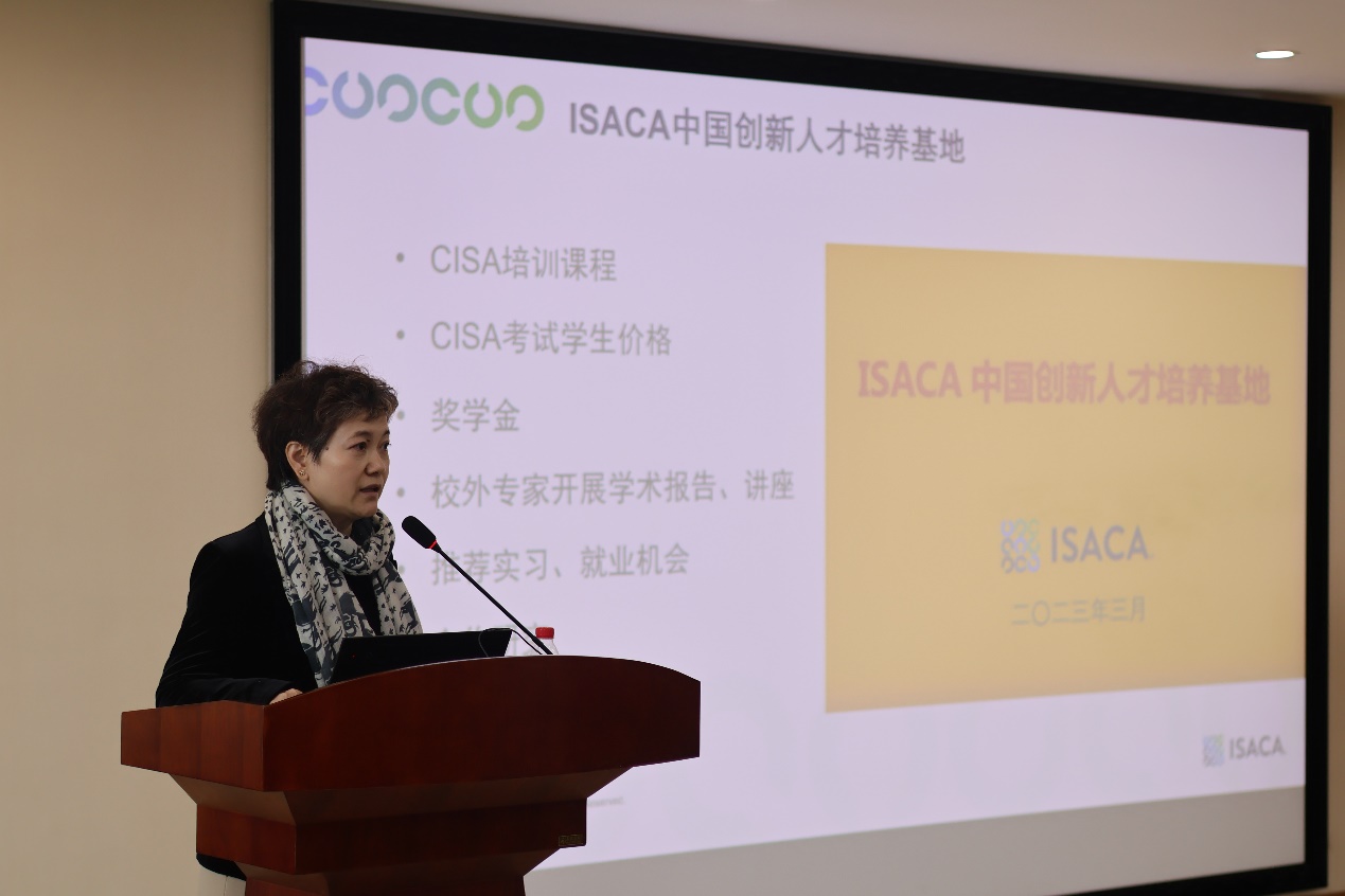 阳春三月,万物生机勃勃,我们迎来了信息管理与人工智能学院和ISACA中国区的合作授牌仪式,开启新一轮的全面合作。ISACA中国区首席代表陈红梅、业务发展总监林志华,中汇会计师事务所(特殊普通合伙)培训中心负责人董巍,学院院长张帅、党委书记徐奇伟与师生代表一起参加活动,会议由副院长隆清琦主持。