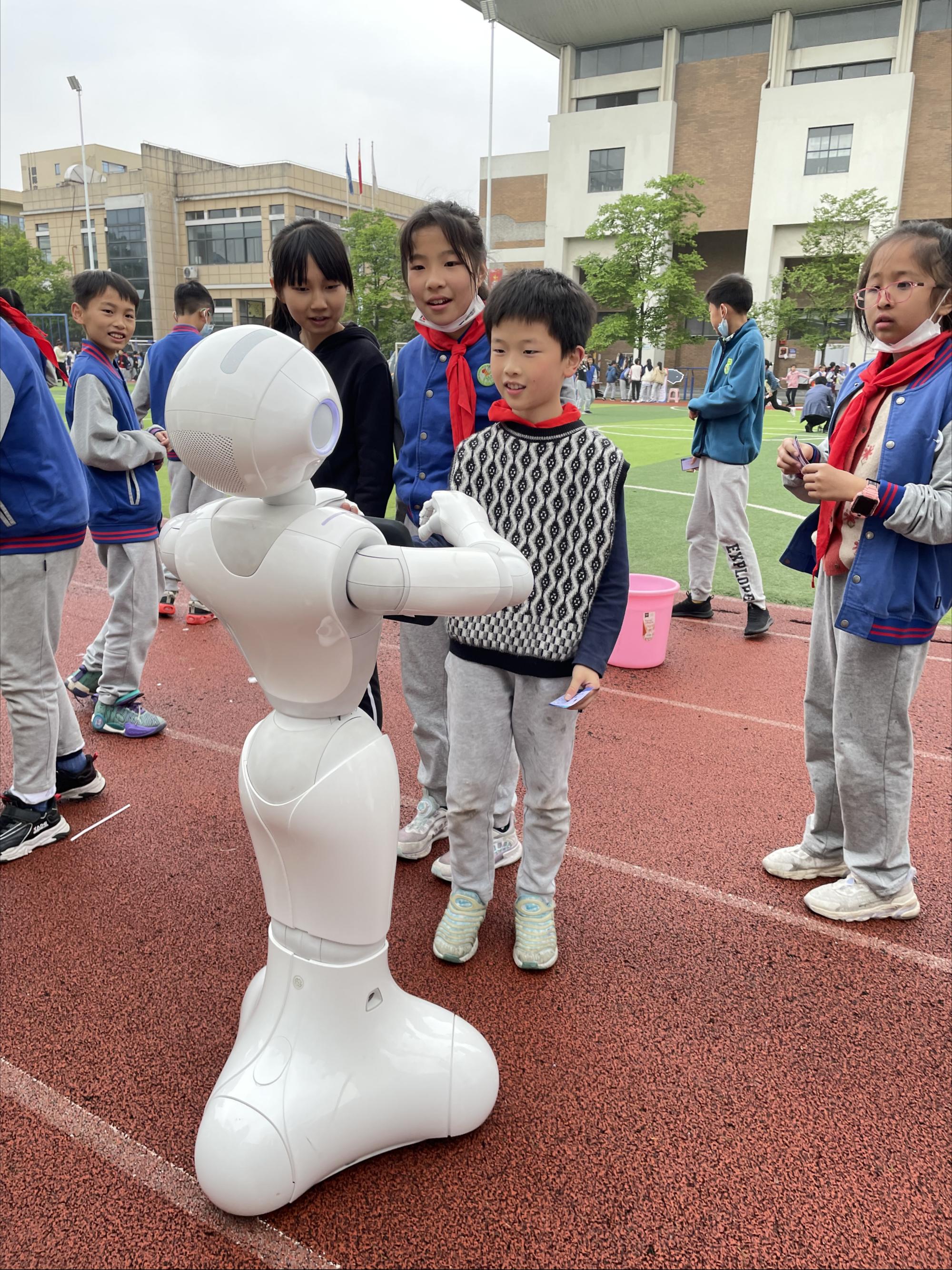老师同学交流起来。在机器人“信小智”《唱支山歌给党听》的歌舞表演声中,文海小学操场的西南角开展着一场关于人工智能教育与党史教育相融合的精彩盛宴。