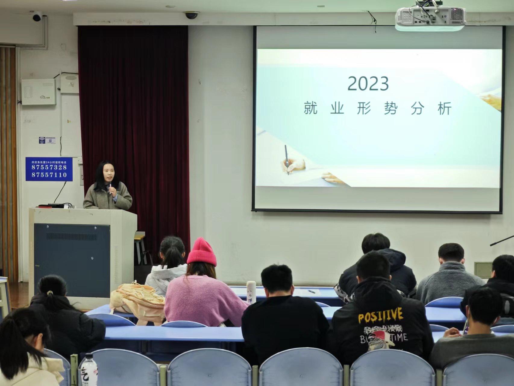 黄娇红老师做“就业形势”专题分享,她从企业HR角度出发,介绍了当下高校毕业生就业形势及用人单位对人才需求发生的变化。黄老师建议同学们调整就业期望值,树立正确的就业观、择业观。此外,她还详细介绍了省市区就业政策、就业补贴申领要求等相关情况。
