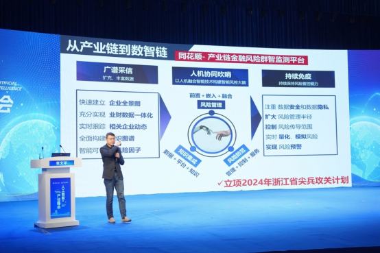 张文宇以“从产业链到数智链:新趋势与新金融”为题作主旨演讲,就以大模型为代表的新一代人工智能技术在金融领域的应用展开分享,其与同花顺公司合作的产业链金融风险群智监测平台通过知识集成、风险管理和风险防范,可以实时量化、模拟风险,实现风险预警。