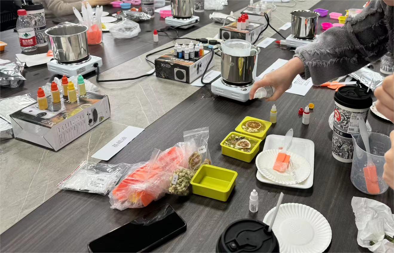 活动现场精心准备了各种制作手工香皂的原材料和工具,包括天然植物油、皂基、香精、色素等。在徐乐老师的指导下,大家纷纷动手操作,按照比例将原材料混合搅拌,倒入模具中定型,再进行一段时间的静置和冷藏,一块块精美的手工香皂就制作完成了。