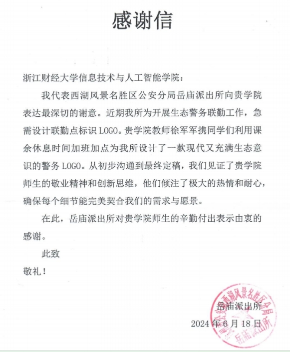 收到西湖风景名胜区公安分局岳庙派出所发来的一封感谢信。来信对雷速体育app