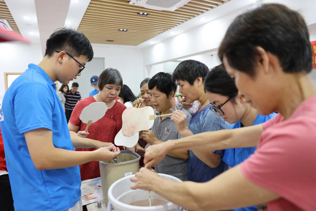 李金昌一行首先来到凤凰村颐乐养中心活动室,现场观摩了实践团开展的助老活动。毛笔字、漆扇、智能手机使用指导、AI修复老照片、防诈宣讲、健康讲堂......现场活动类型丰富,气氛欢乐而热烈。