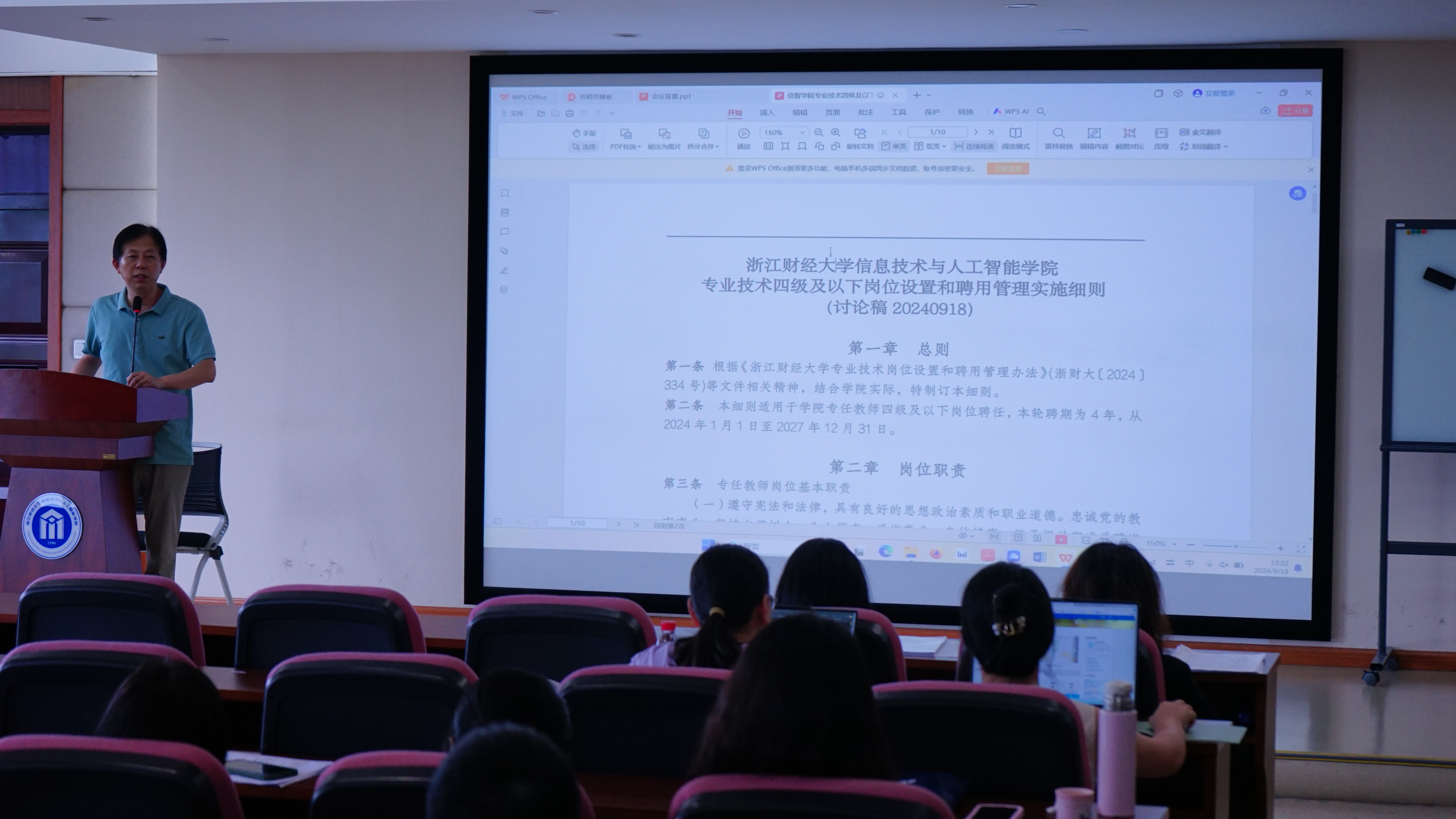 张帅院长首先传达了校人事处《浙江财经大学专业技术岗位设置与聘用管理办法》浙财大【2024】334号文件精神,同时解读学院专业技术四级及以下岗位设置与聘任办法讨论稿。他指出各系部、各教师应充分认识岗聘工作的重要性,仔细对照相关办法,结合自身特点,选择岗聘类型,并对完善学院聘任办法提出建设性意见和建议。