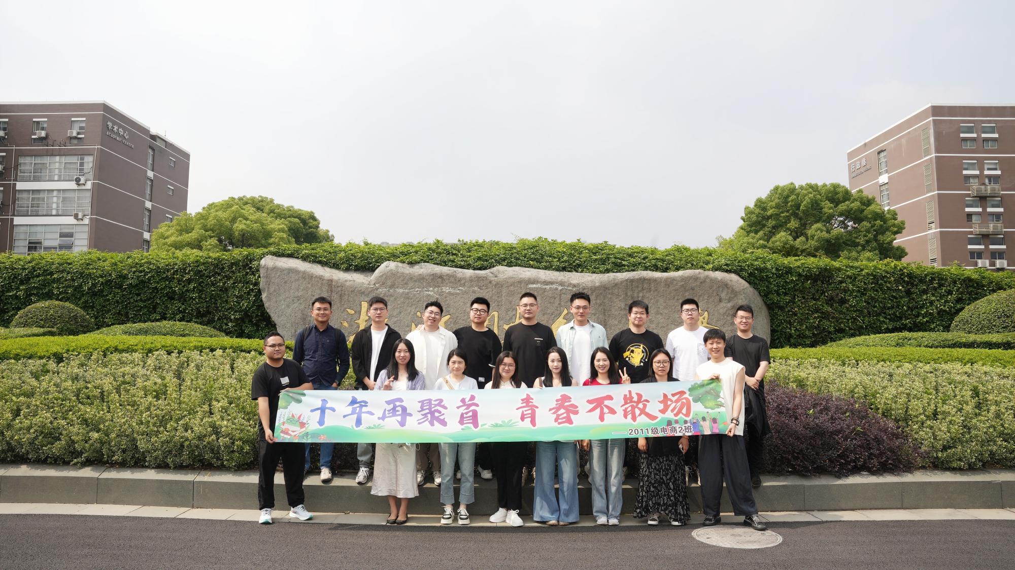 2015届电子商务2班毕业十周年聚会在我校下沙校区温情启幕。20位游子从湘西、铜仁、北京等天南海北奔赴而来,在熟悉的校园里共赴这场青春之约,重温往昔同窗谊,再叙今朝别后情。