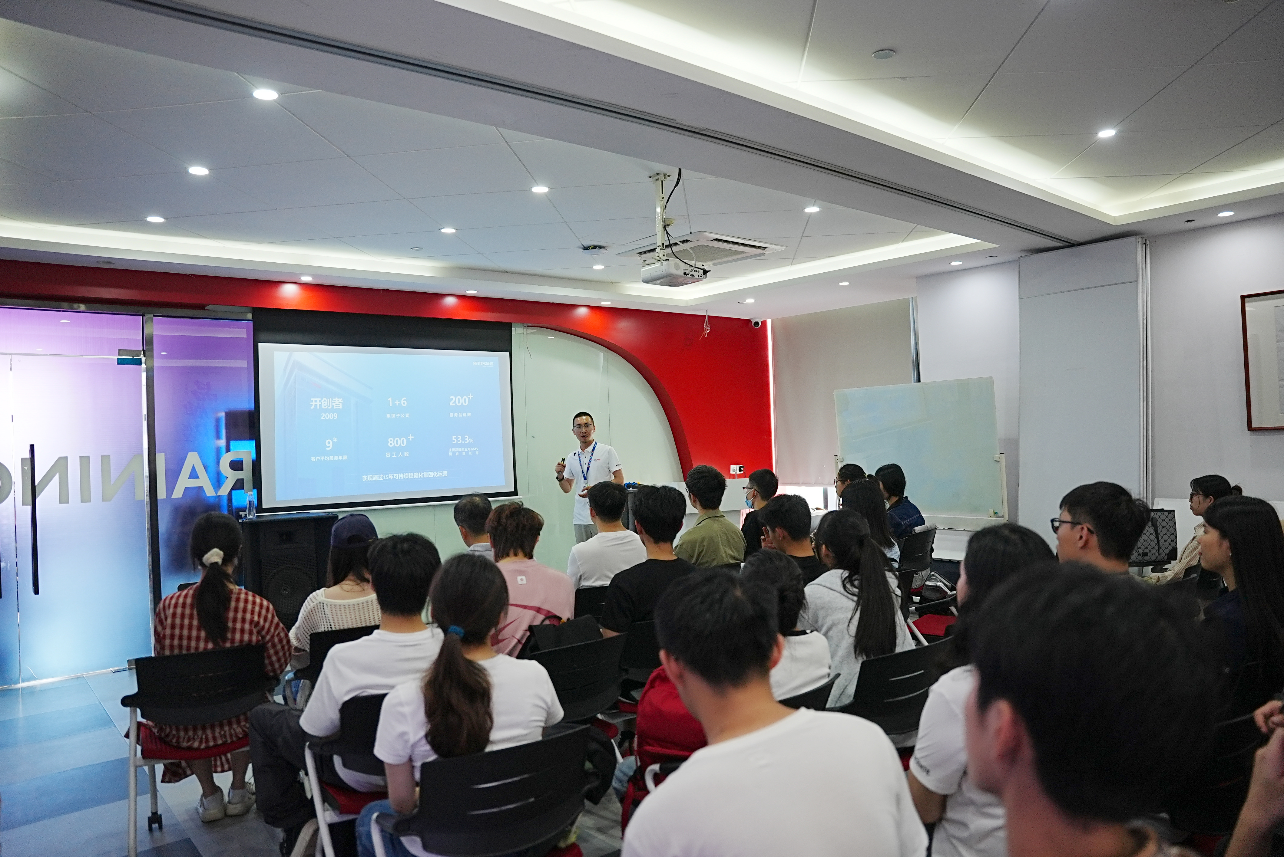 在工作人员的引导下,师生参观了网营科技的办公环境、核心业务展厅及数字化创新实验室。公司负责人详细介绍了企业发展历程、业务布局及在电商服务、AIGC技术应用等领域的特色成果。学生现场体验了AI内容生成工具的操作流程,并参与直播场景模拟实践,直观感受行业前沿技术的落地应用。