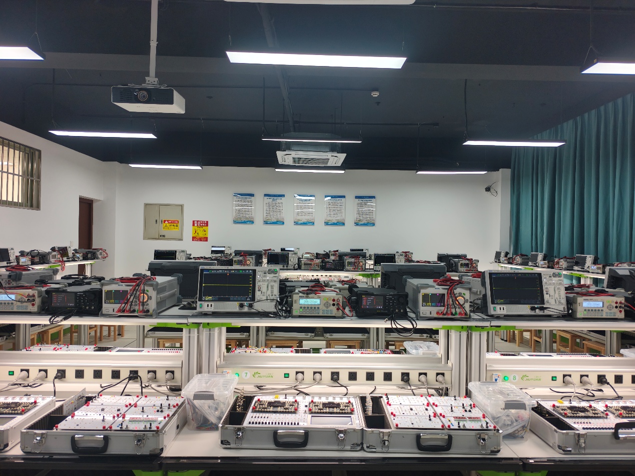 空间布局更优化。电子技术实验室采用“回字式” 布局,配置 26 张实验台,可同时容纳 52 名学生开展实验,满足集体教学需求;计算机软件实验室升级座位布局,将原有 “左、中、右各 4 座” 调整为 “3-5-3” 结构,同时整体前移增设一排座位,不仅总座位数增加 2 个,还额外新增 16 个隔位考试座位,兼顾日常教学与考试场景。