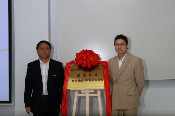 下午,学院举行遥望“商务智能与可视化实验室”启用揭牌仪式。浙江财经大学副校长李占荣,遥望科技董事长兼CEO、2005届计算机专业校友谢如栋、遥望科技技术总监黄邦波、遥望科技董事长秘书陈颖、校友办公室主任吴玻、学院院长张帅以及师生代表参加,仪式由学院党委书记吴翼泽主持。