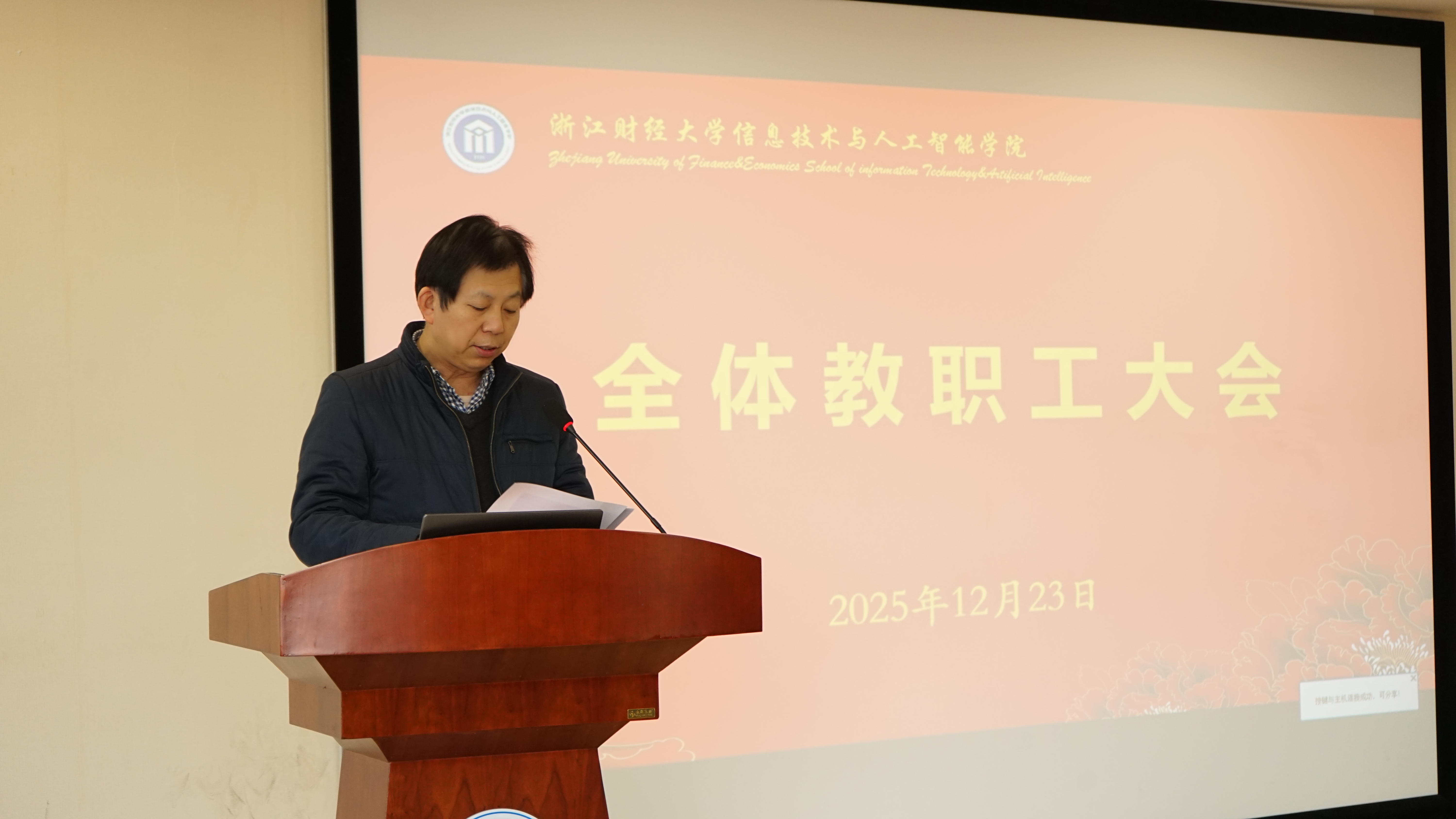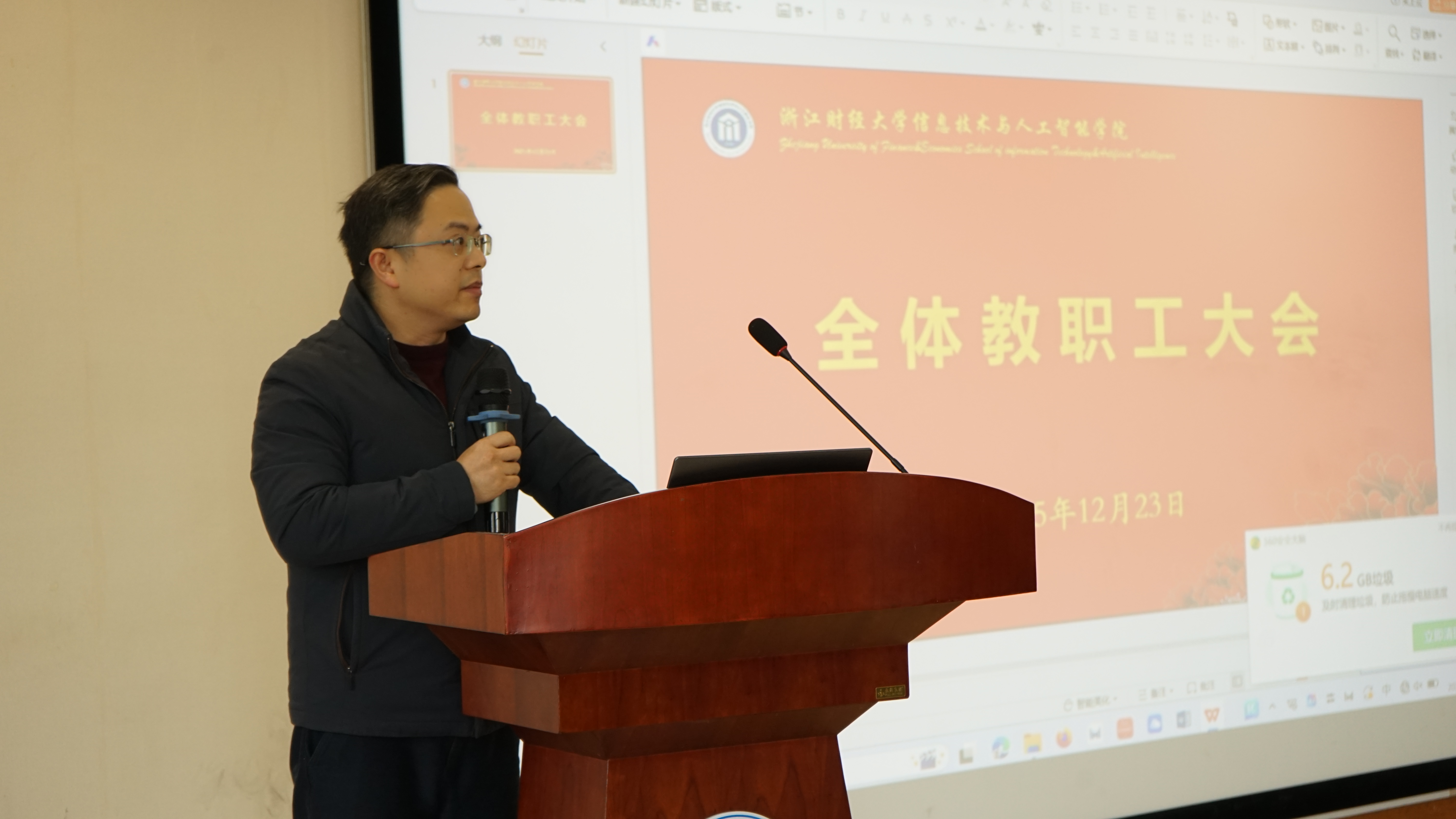 12月23日下午,信智学院期末全体教职工大会在9号楼302报告厅顺利召开。会议深入传达学习学校近期工作精神,全面总结学院2025年度各项工作成效,并对期末重点任务进行部署。学院领导班子成员及全体教职工参会,会议由学院党委书记吴翼泽主持。