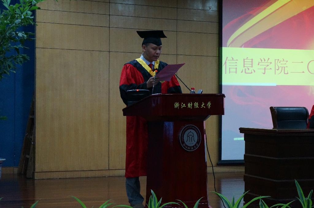 首先由信息学院院长张文宇老师致辞。张院长向学业有成,即将踏入社会,开始人生新征程的全体毕业生表示最热烈的祝贺,同时对浙江财经大学信息学院第一届毕业生给予了深厚期望。他对毕业生强调三点:一、永远不要放弃心中的梦想;二、做一个“社会”人;三、家庭才是核心和生命。张院长的一席话动情动理。