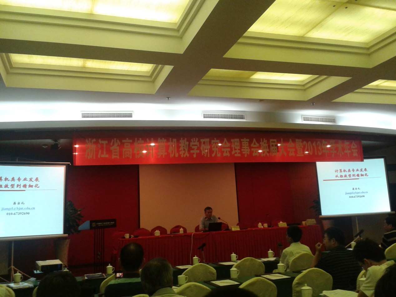 2013年8月14日至8月16日,浙江省高校计算机教学研究会2013年学术年会在美丽的海滨小城象山召开。作为浙江省内最具影响力计算机类教学研究会议,今年吸引了来自省内50多所高等学校与高职院校的150余名代表参加,发表教学研究论文31篇。信息学院党委书记王衍教授、教学副院长马雪英副教授、计算机基础课程负责人刘亚楠副教授、王竹云高工、应小凡副教授等一行5人应邀参加了会议。本次会议上,特邀嘉宾,教育部计算机类专业教学指导委员会副主任,北京工业大学蒋宗礼教授作了《计算机类专业发展——从粗放走向精细》的特邀报告;特邀嘉宾,教育部软件工程专业教学指导委员会副主任,南京大学骆斌教授作了《软件工程优先的专业课程体系》的特邀报告;特邀嘉宾,教育部大学计算机课程专业教学指导委员会副主任,浙江大学何钦铭教授作了《计算思维与大学计算机课程知识体系》的特邀报告。