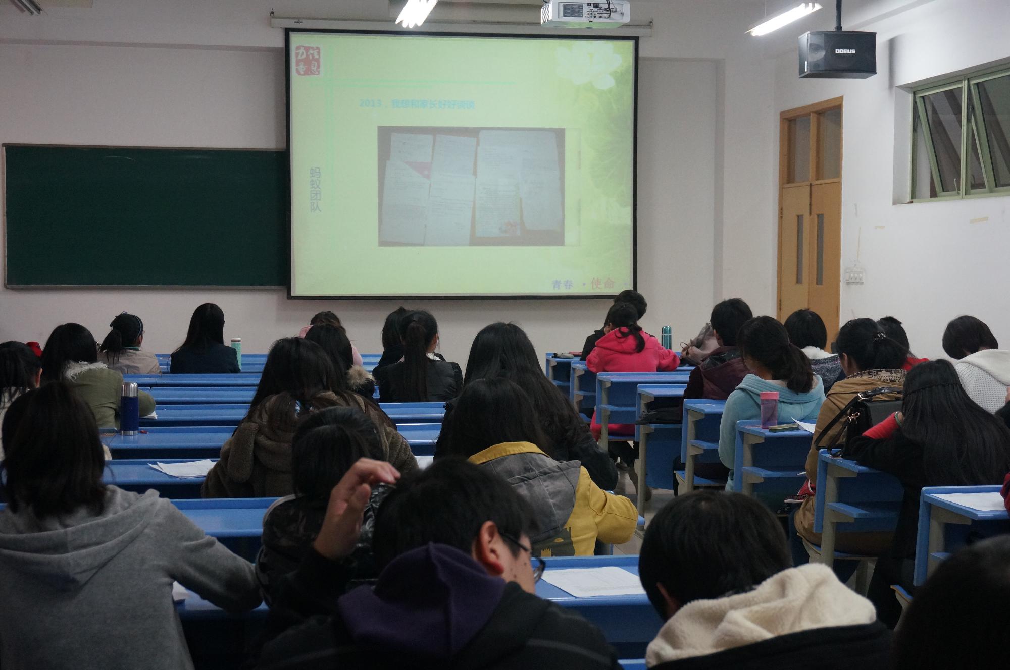 2013年11月26日星期二下午三点,朋辈课堂《公益那些事儿》在A108准时开讲,本次讲座主讲人为11信息1班的郭懿萱学姐,学姐是今年暑假奔赴雅安支教的志愿者之一,她向同学们展示了在雅安支教的照片,与同学们分享关于此次志愿活动的感悟。