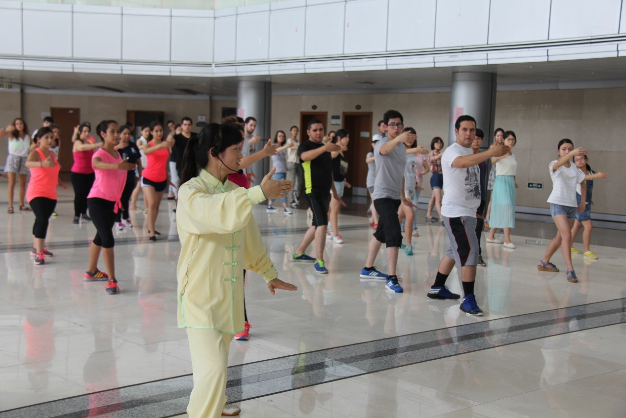 只见老师身着一袭黄衣,先演示了几个太极的基本动作及一套精心挑选的入门套路,美国学子在一旁认真地观看品味。老师在把连贯动作演示后,就把太极基本动作一一分解开来教他们练习,同时伴着详细的动作解释。一招一式,他们都学得有板有眼,颇有味道。学习的过程中,难免有难以理解或是不标准的动作,老师也会不时地停下来给予耐心的教导。基本动作习好后,便开始了那套连续动作的教学。外国学生也不辞辛苦的学习,足足过了一把中国功夫的瘾。让他们在感受民族特色的同时,也体验到了这种以柔克刚、以弱胜强的东方武术之道。