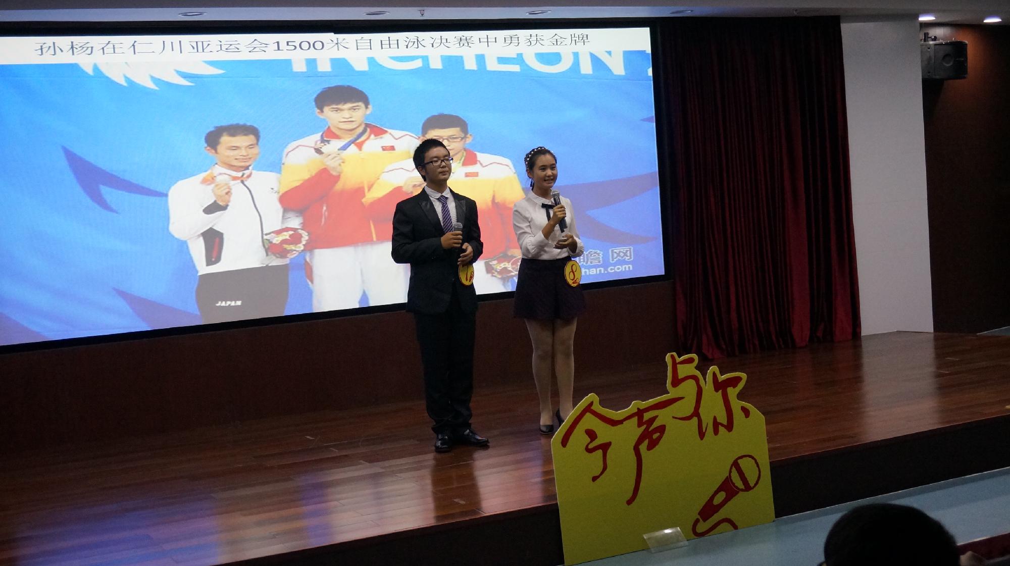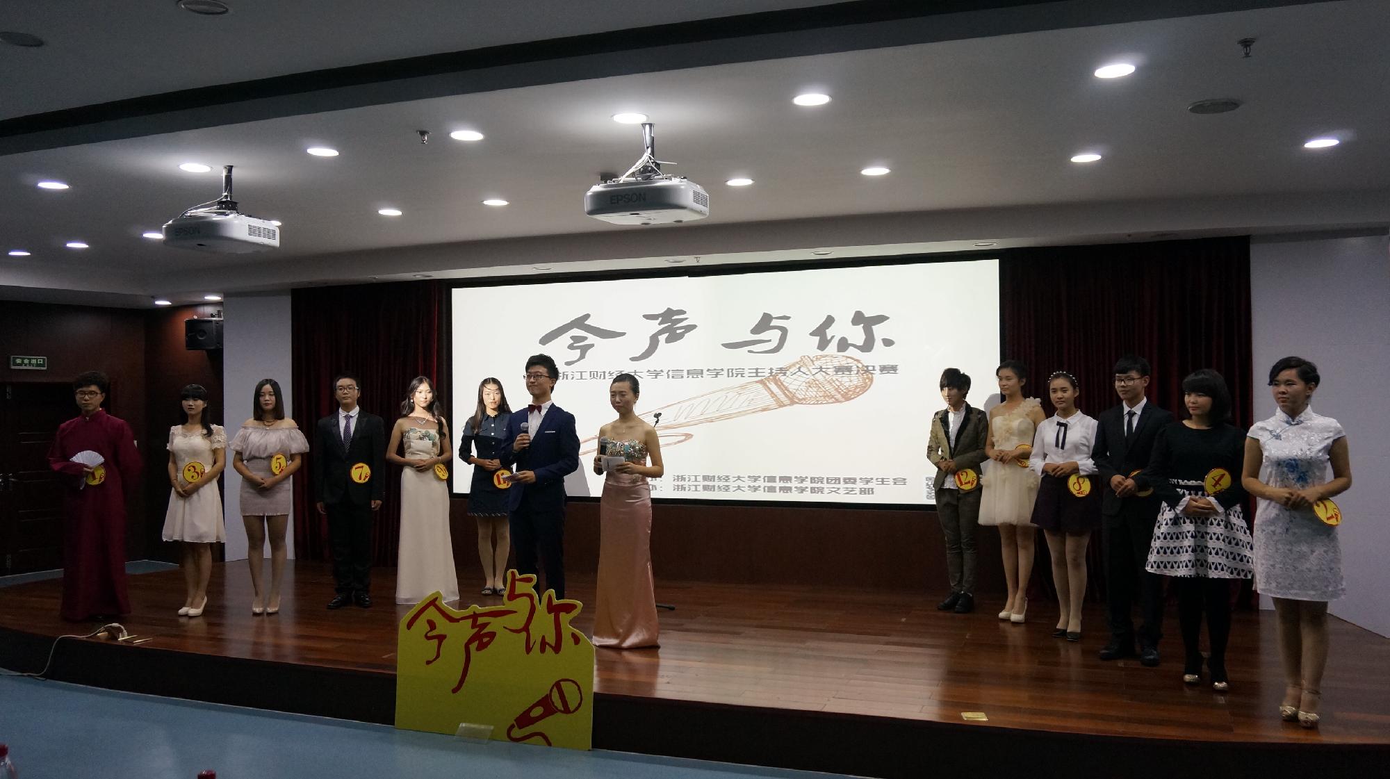 2014年10月19日晚6时30分,由浙江财经大学信息学院团委学生会文艺部举办的“今声与你”——浙江财经大学信息学院2014年度学院主持人大赛决赛在学术中心四号报告厅举办。校艺术团主持朗诵组组长潘佳丽同学,校艺术团主持朗诵组副组长孙宏明同学,2013年度校主持人大赛金话筒鲁煜同学,2013年度校主持人大赛银话筒蒋宇飞同学,校主持朗诵组资深成员、2013年度财政学院银话筒陈兵文,2013年度校主持人大赛最佳潜力奖获得者王睿同学出席并担任大赛评委。学院领导、辅导员及2014级全体新生参加了活动。