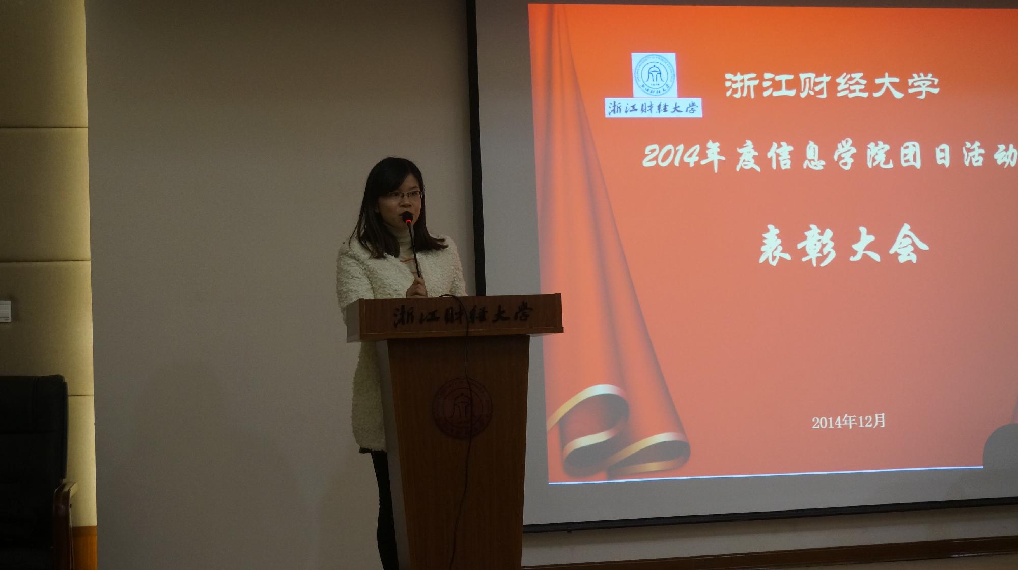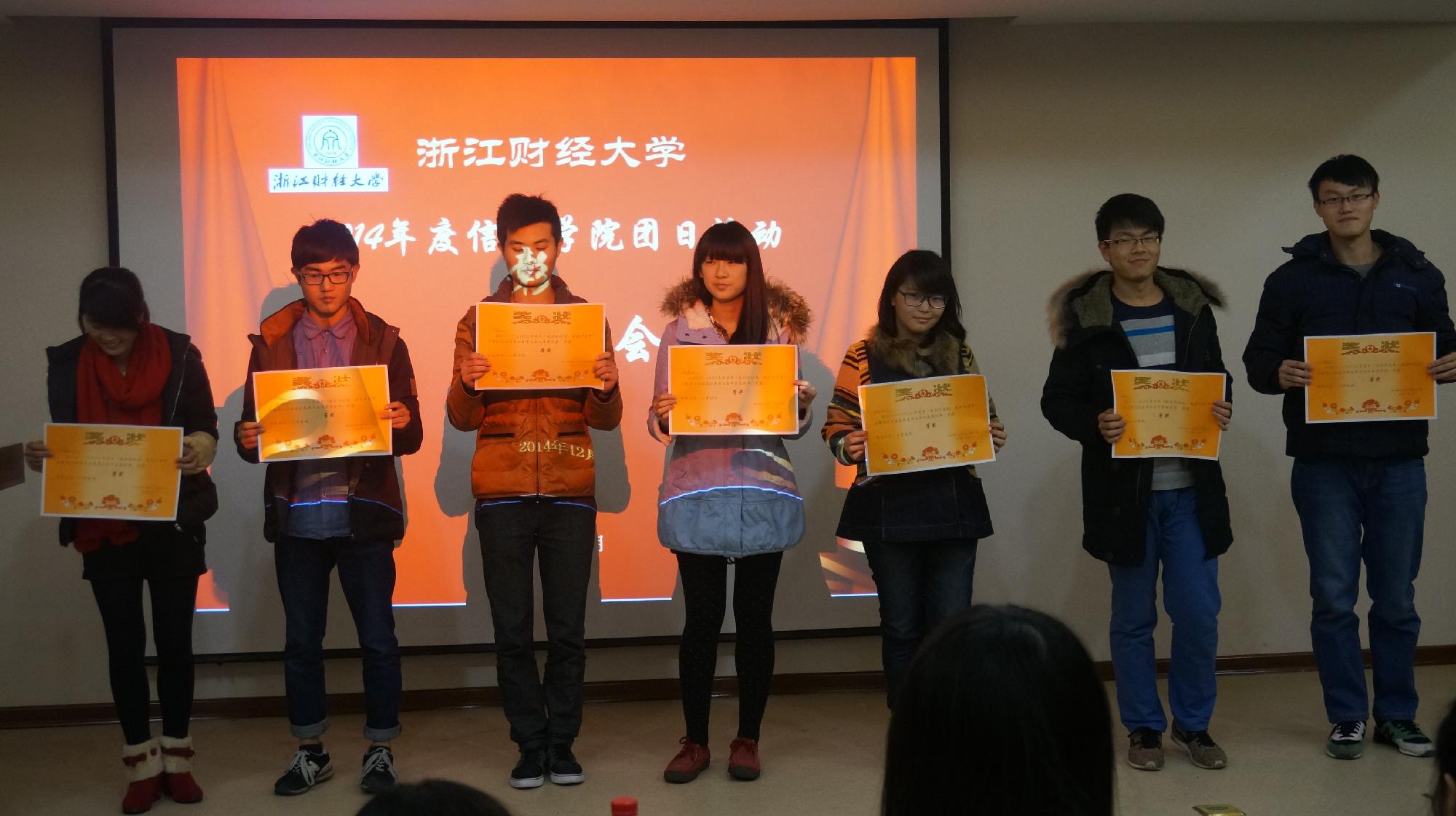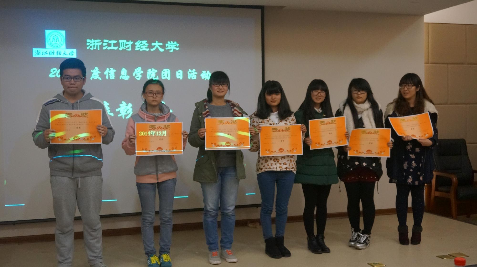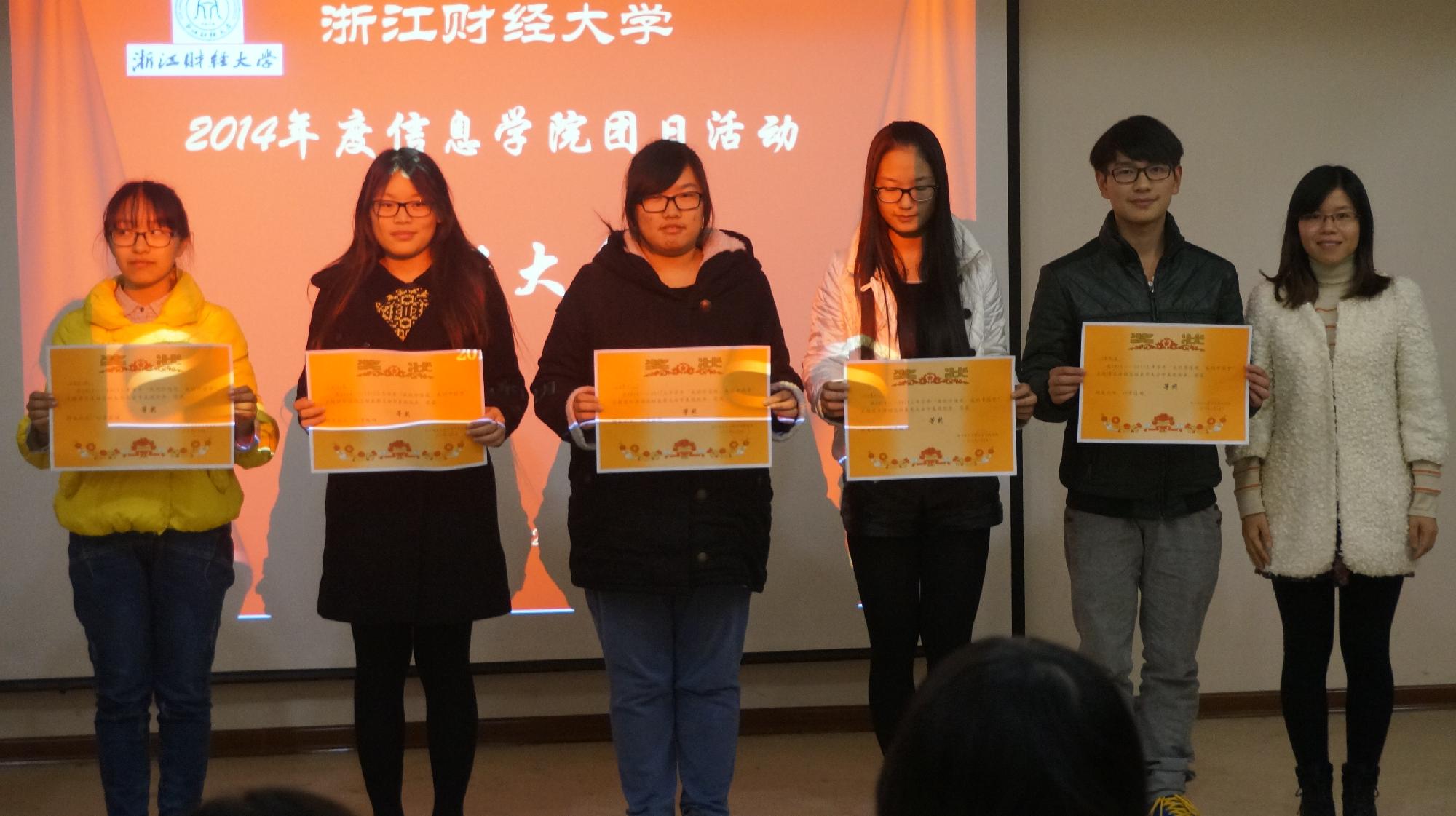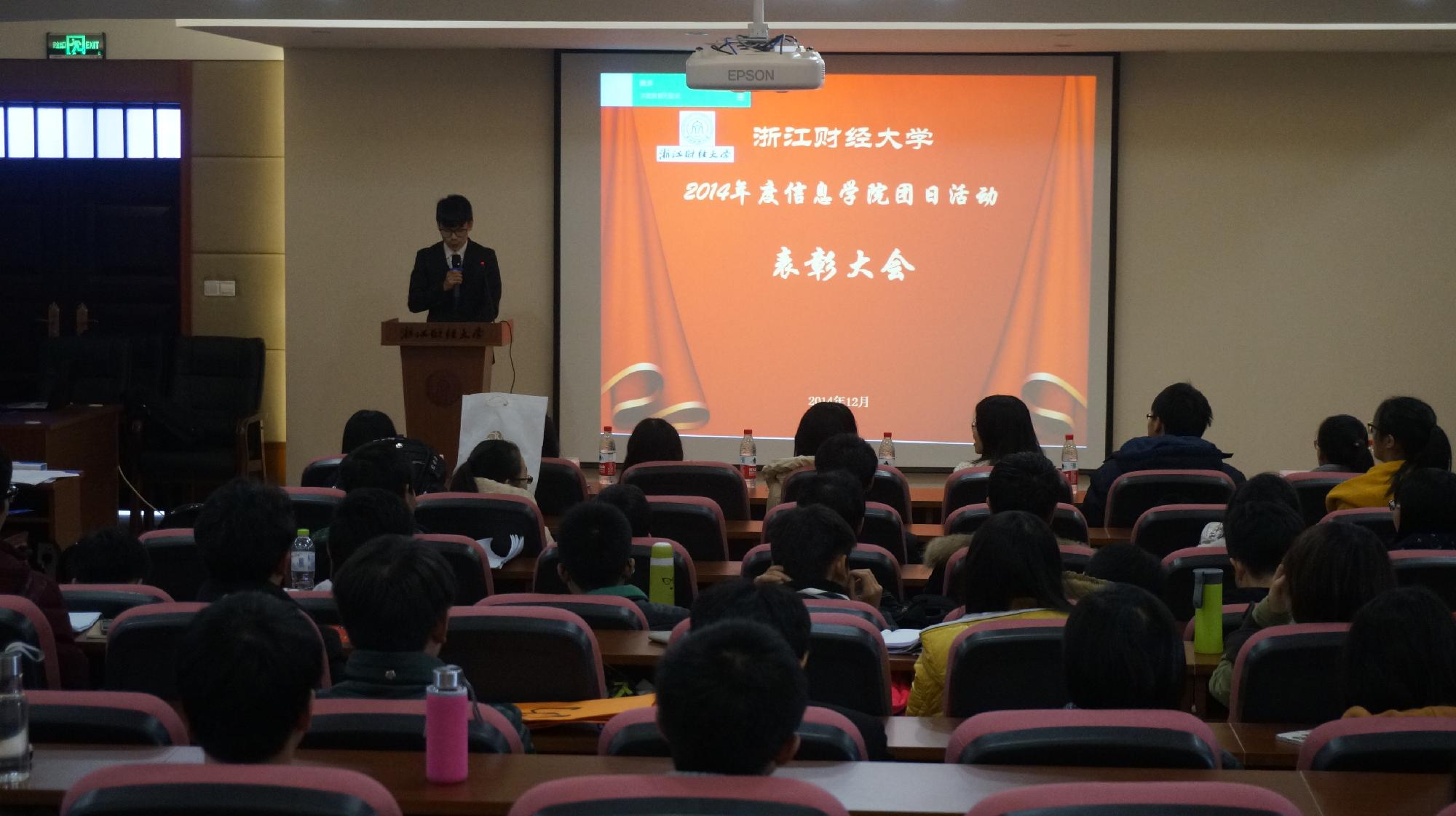 本次表彰大会包括团日活动风采展演和评比表彰两项内容。在主持人叶鹏翼的精彩主持下,各个班级团日部精心准备的节目也陆续上演。音乐剧、歌曲联唱、魔术、舞蹈、情景剧应有尽有,值得一提的是让人记忆深刻的太极拳和双截棍表演。各班级团支部围绕“我的价值观,我的中国梦”团日活动主题,创新形式,创作出许多生动、丰富、新颖,贴近大学生活,蕴含信息特色、财大特色的节目,让人耳目一新。在整场表演中,现场气氛活跃,观众的笑声和掌声此起彼伏……评选接近尾声,也是最激动人心的时刻,在综合评委团的打分及书面材料分数后,一二三等奖最终出炉,其中13软工、13计算机1班、13信息1班、12软工、14软工荣获一等奖。
