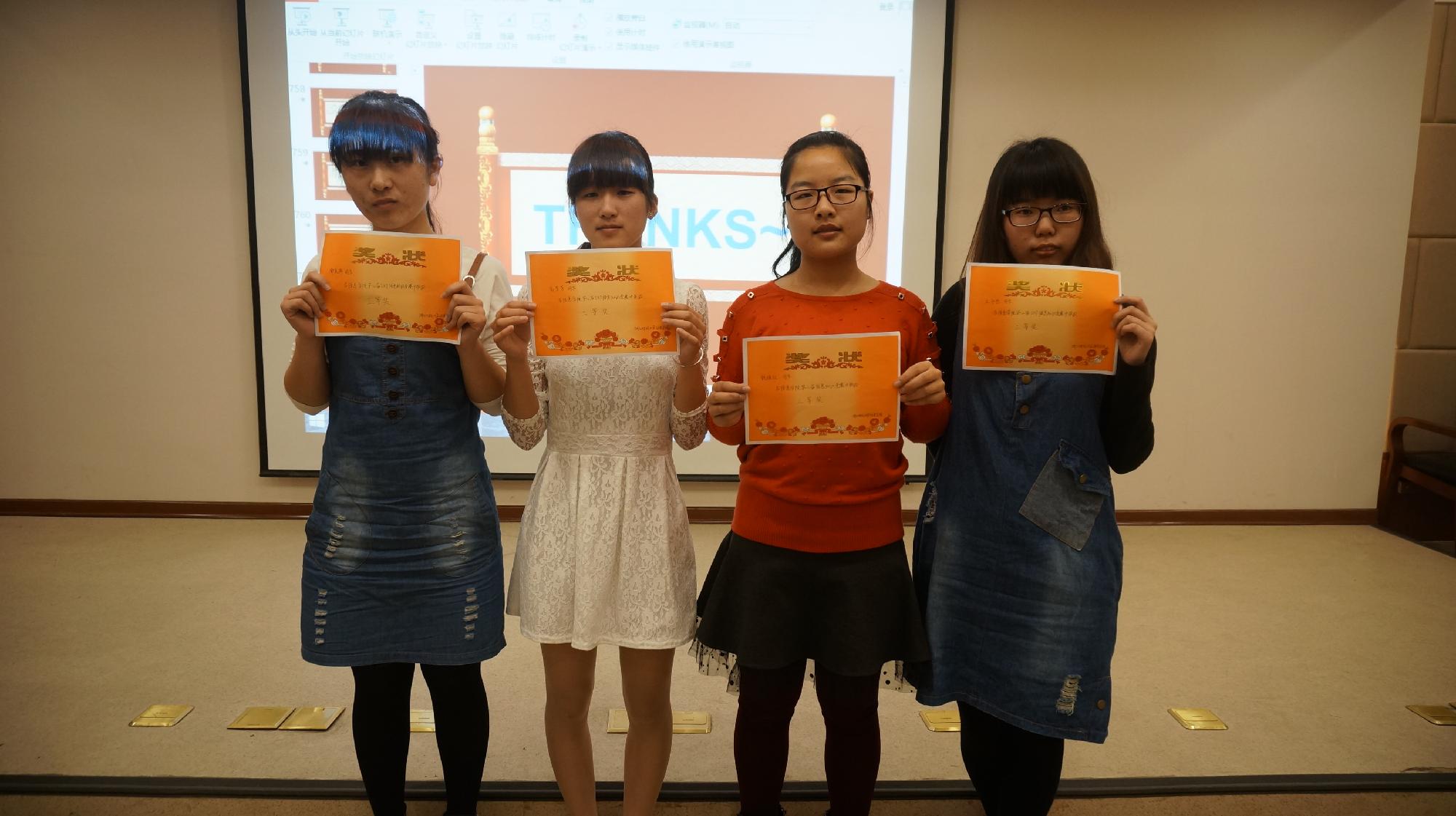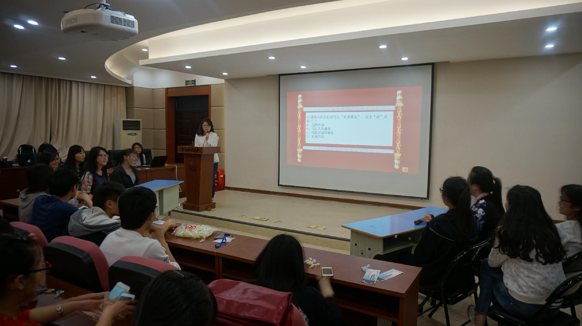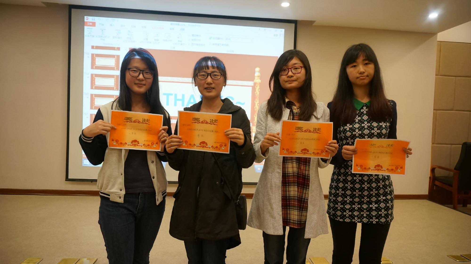 第二轮“个人赛”是本次比赛的高潮,由第一轮决出的七支队伍的队员们的精彩表现引得台下掌声不断,最终由洪羽佳、余瑶、徐昕、杜赛男领队的十三队成功“一站到底”,问鼎终极大奖。在比赛期间还特别设立了微信摇一摇“观众答题”环节,充分调动了现场观众与参赛人员的积极性。最后进行了现场颁奖仪式,活动在热烈的掌声中圆满落幕。