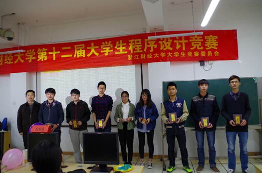 2016年4月9日,在美好的春日里,浙江财经大学第十二届大学生程序设计竞赛在9号楼102拉开了帷幕。作为一项已经成功举办多届、具有一定影响力的程序设计竞赛,该赛事一直以来都深受广大编程爱好者的追捧和热爱,这也是他们展现自己编程实力的舞台。据悉,本次比赛共吸引了四十余支队伍的参与,覆盖数科学院、财政学院、艺术学院、信工学院、东方学院等多个学院的学生。 早上10点,ACM协会的工作人员、志愿者们就都已经到位了。10:30点左右,已经有参赛队伍陆续来到9号楼前等待,队员们都带着期待的笑容相互讨论着,充满了自信。不一会儿参赛队伍渐渐多了起来,工作人员维持着现场的秩序,安排队伍轮流抽签并登记。 中午11:30,开幕式正式开始。信工学院副院长马雪英、张帅,程序设计指导老师陈琰宏、朱凌以及教务处汤静超老师等参加了开幕仪式。副院长马雪英老师为本次竞赛做了开幕式致辞,马老师讲述了财大ACM的发展,同时也对此次竞赛给予了肯定。比赛于12点整正式开始,各个参赛小组立刻全身心地投入了比赛之中。