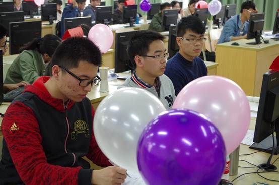 比赛氛围是紧张的,选手们要在四个小时的时间中完成十几道问题,考验选手的思维和素养的同时,也无形中考验了选手的心理素质。这是一场以团队为单位开展的比赛,团队成员之间的配合也就极为重要。创新精神也是完成比赛的关键之一,在程序设计中,选手们会面临各种各样的难题,有时候,老办法可能解决不了新问题,大胆创新,尝试不同的路,就很可能会意想不到的收获。比赛场上不时响起一声声解题正确后的欢呼。每当队伍正确解答出一道题目时,工作人员便会送上该题相应颜色的气球。
