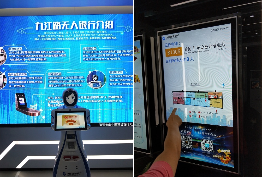 随后老师们又来到建行九江路无人银行参观,无人银行采用智能门禁系统、智慧柜员机、VTM机、外汇兑换机以及AR、VR等互动体验设备来开展业务,各种自助机具能承担绝大部分传统网点的现金及非现金业务,对于VIP客户还专门开辟独立空间和专属客服,并通过远程视频系统由客户经理一对一服务,无人银行依托人工智能,结合互联网、大数据等科技成果的应用。