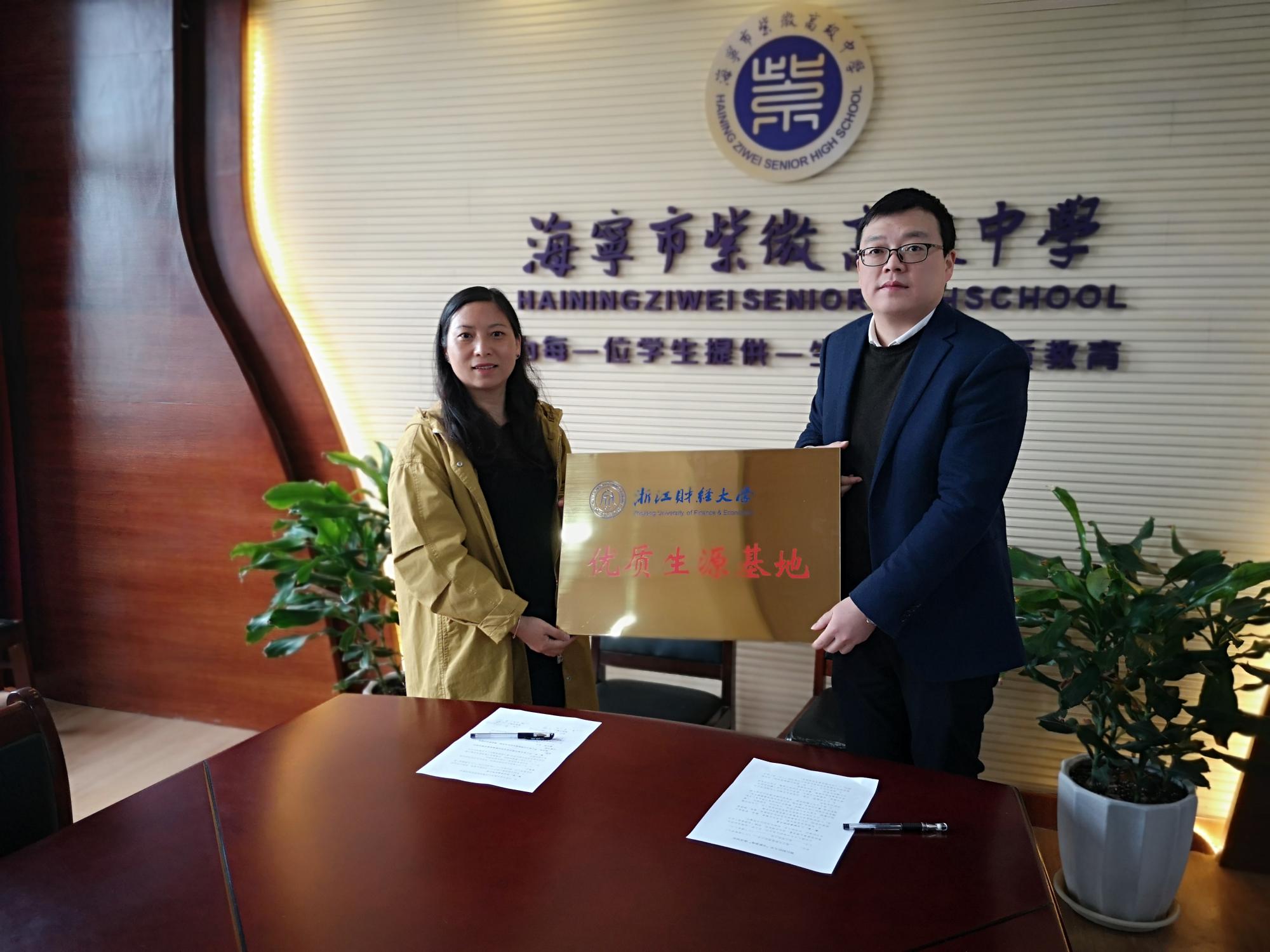 最后陆书记向海宁市紫微高级中学授予“浙江财经大学优质生源基地”铜牌并进行了签约仪式。