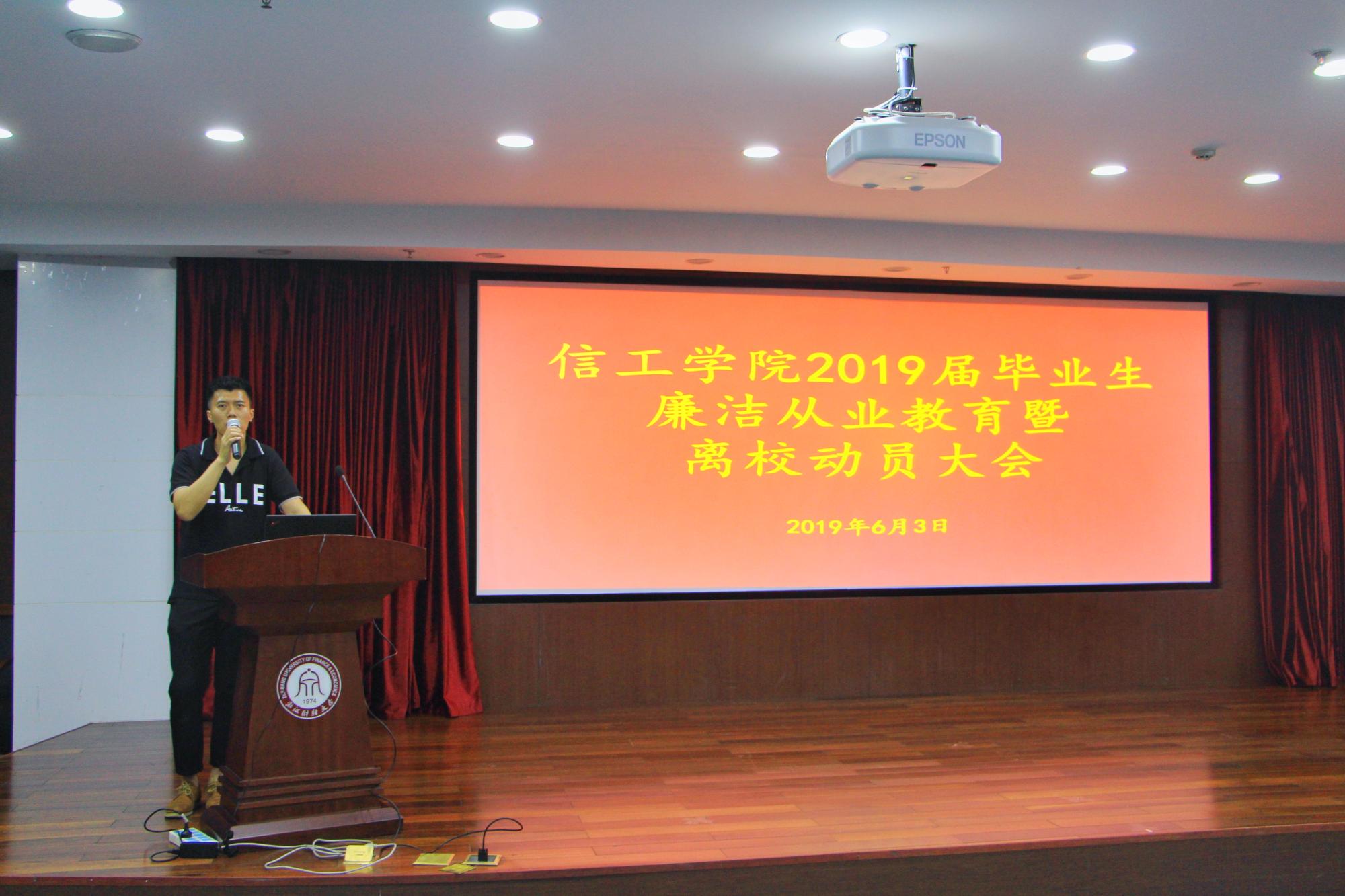 在学术四号报告厅举行2019届毕业生廉洁从业教育暨离校动员大会。出席本次大会的有学院党委副书记陆颋浩、学工办主任陈小芳、辅导员冯李哲、车鹏以及2019届全体毕业生。本次大会旨在为帮助毕业生安全、文明、顺利离校,同时为毕业生进行廉洁从业教育,坚定理想信念,增强廉洁从业意识,树立爱岗敬业观念,为毕业生上好最后一课。