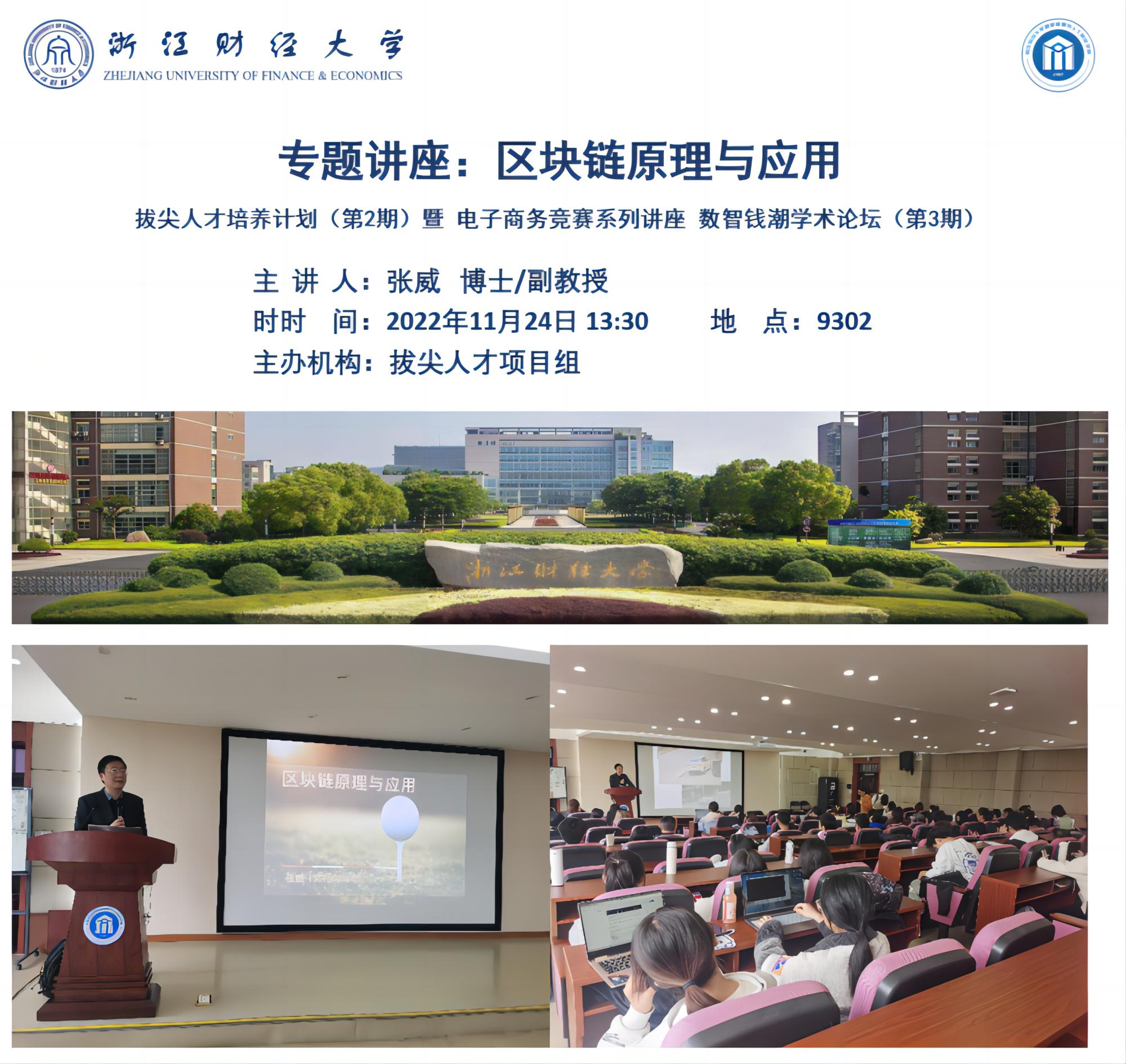 2022年11月24日13点30分,2022年度拔尖人才培养计划(第2期)暨电子商务竞赛系列讲座、钱潮学术论坛(第3期)在9号楼302教室成功举办。张威博士/副教授以“区块链原理与应用”为主题,让学生们全面了解了区块链技术在新的技术革新和产业变革中的重要作用。区块链作为一种底层协议或技术方案可以有效地解决信任问题,实现价值的自由传递,在数字货币、金融资产的交易结算、数字政务、存证防伪数据服务等领域具有广阔前景。