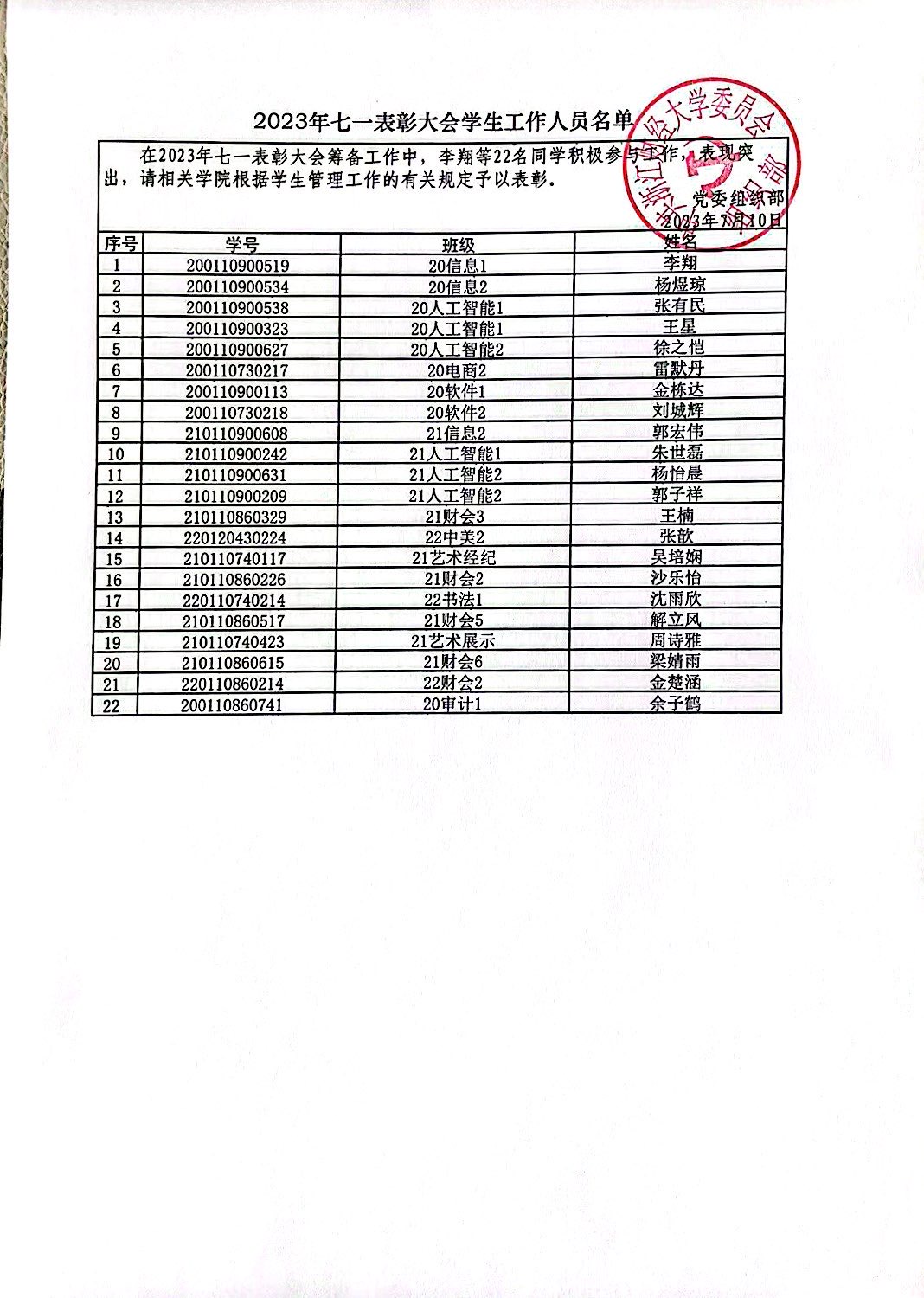 2023年6月29日,雷速体育app 圆满完成了学校“循迹溯源学思想 砥砺奋进建新功”七一表彰大会的承办工作。期间,李翔等22名同学担任学生工作人员,扎实工作,甘于奉献,表现突出,积极协助校党委组织部和学院党委完成大会的筹备和组织工作,大会得到学校领导和师生党员的广泛好评。经校党委组织部研究决定,对上述同学进行通报表扬,以资鼓励。名单如下: