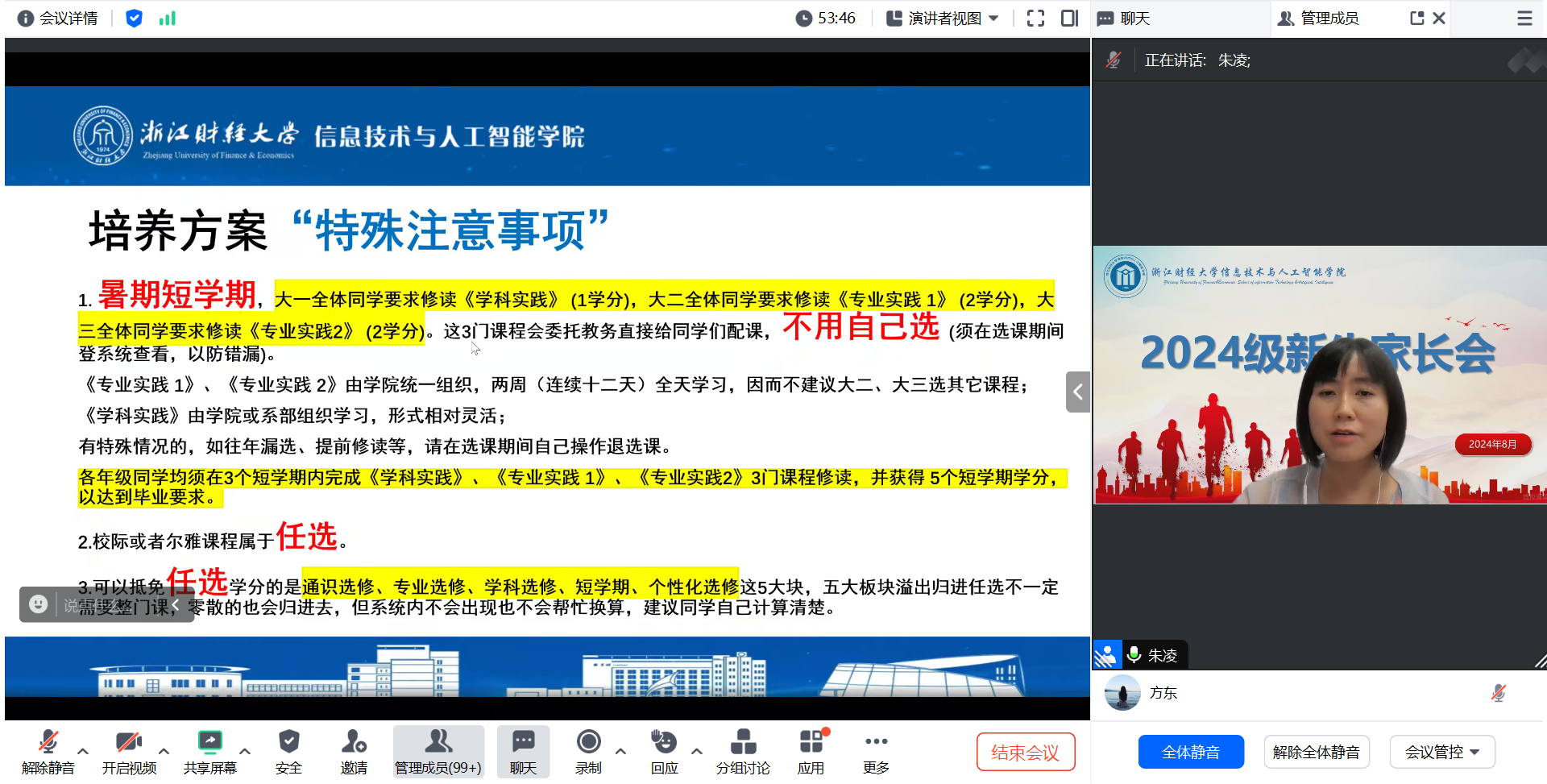 吴轶韵副书记向家长们介绍了我校学生管理制度和“新财经战略”背景下MAQ型“浙财金生”家校协同育人培养路径,并特别提醒临近的入学,开学各项注意事项。