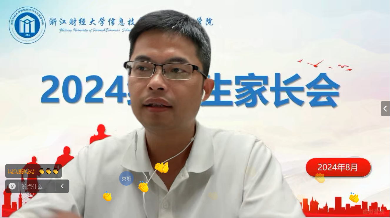 2024级新生家长会在线上顺利召开,学院院长张帅,党委书记吴翼泽,副院长林剑、朱凌,党委副书记吴轶韵,院长助理陈明晶,系主任陈琰宏、涂乐,学办主任洪宝华,新生班主任、辅导员及24级新生家长近300人参加本次家长会。会议由吴翼泽老师主持。