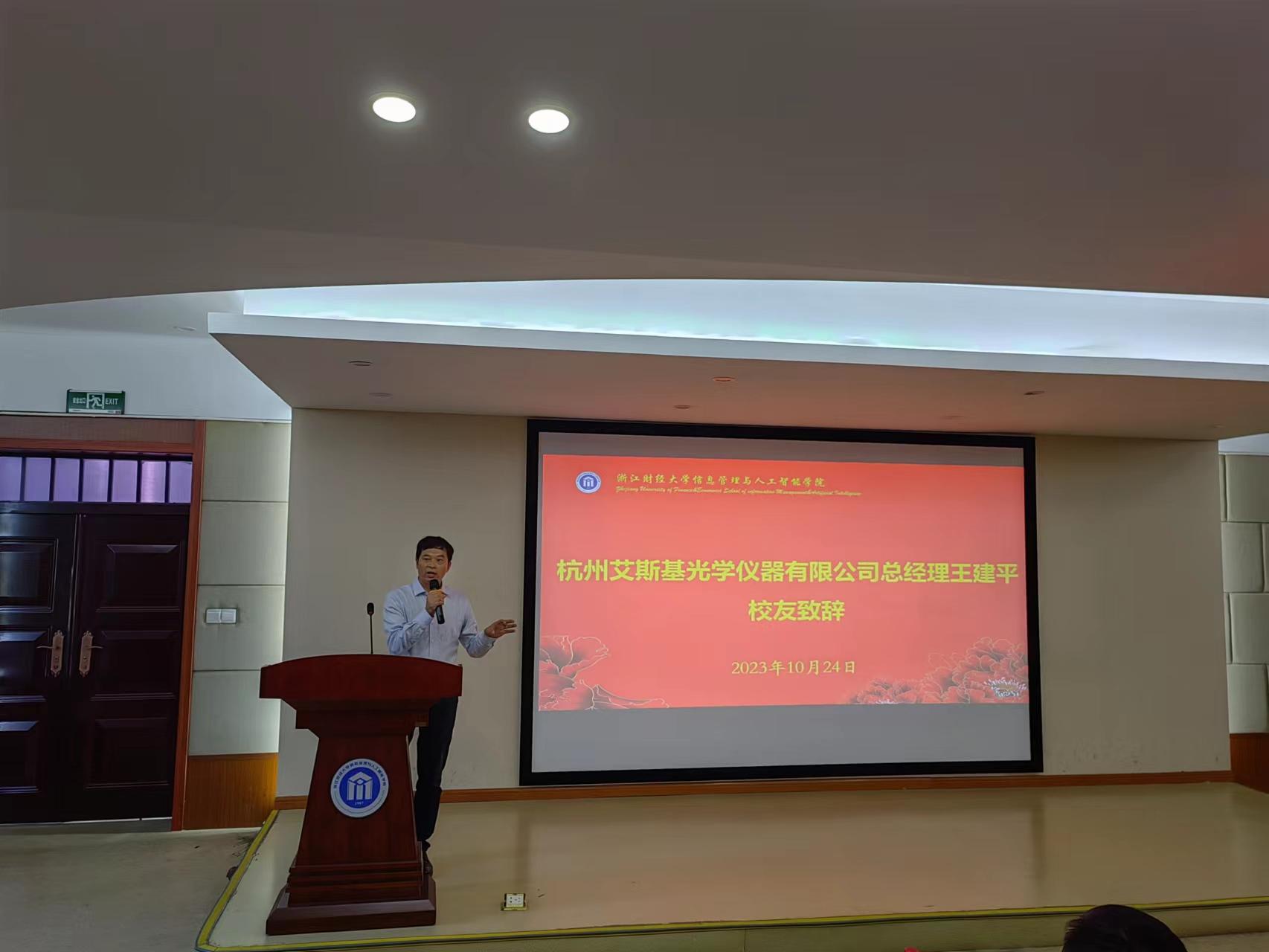 王建平校友为2023届申博成功的硕士毕业生颁发了2023年度“艾斯基—登峰”奖学金,并赠送了精美礼品。王建平校友通过分享自己在浙江财经大学上学的故事教导与会同学要珍惜美好年华,通过赠送公司产品望远镜鼓励信智学子登得更高、望得更远,在社会主义现代化建设新征程中再创佳绩。