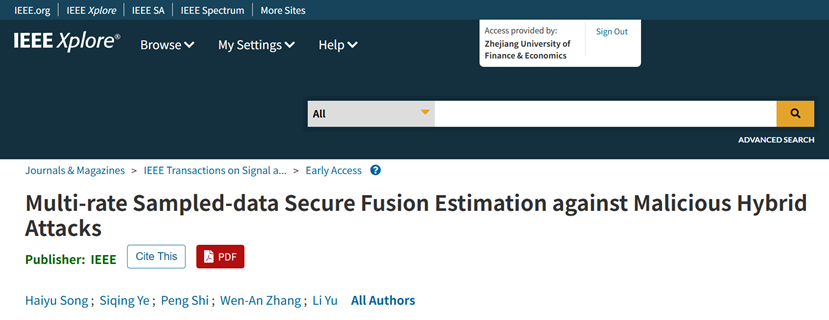 2021级人工智能3班本科生叶思卿同学在宋海裕教授的指导下,在IEEE Transactions汇刊《IEEE Transactions on Signal and Information Processing over Networks》上发表了题为“Multi-rate Sampled-data Secure Fusion Estimation against Malicious Hybrid Attacks”的研究论文(导师一作、学生二作)。