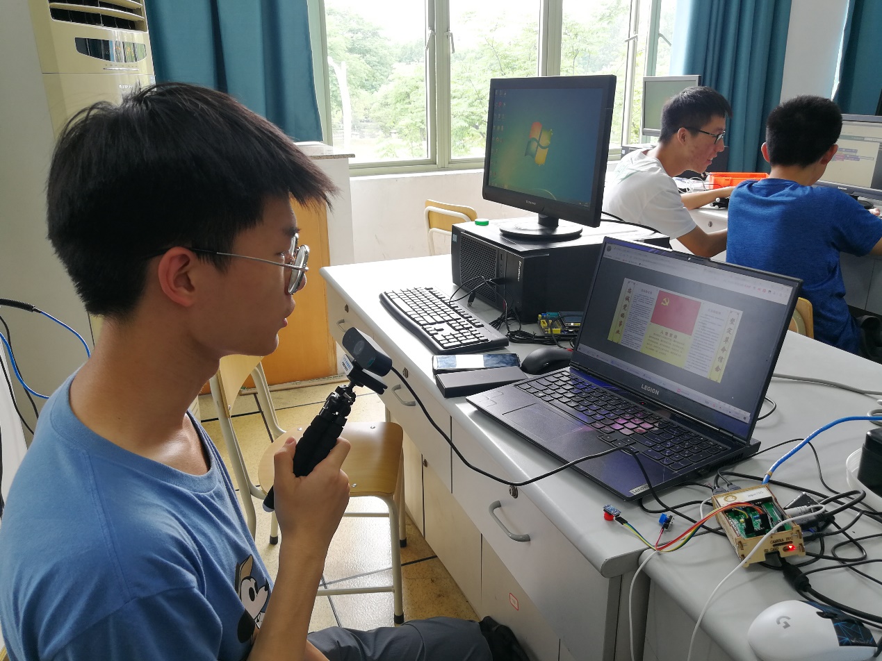 来自工商学院的倪嘉毅同学和财税学院的覃帅同学、金融学院的张文俊同学在朱老师的指导下设计实现了一个虚拟仿真点歌台,通过物联网播放出“没有共产党就没有新中国”等振奋人心的红色歌曲,并结合语音识别、文字识别、机器翻译等技术编写程序将朗读的入党誓词在屏幕中显示出了中英文不同版本。三位同学表示:“朱凌老师形式新颖、妙趣横生的通识课不仅让我们能马上检验自己的学习成果,还能近距离地体验到人工智能、物联网等前沿信息技术在智能时代中的广阔应用;同时,在建党百年这个特殊的时间段,朱老师带领我们重温党史,感受党的奋斗历程和伟大精神,让课堂学习更具有丰富的内涵与意义,同学们也更加珍惜今天来之不易的幸福生活。”